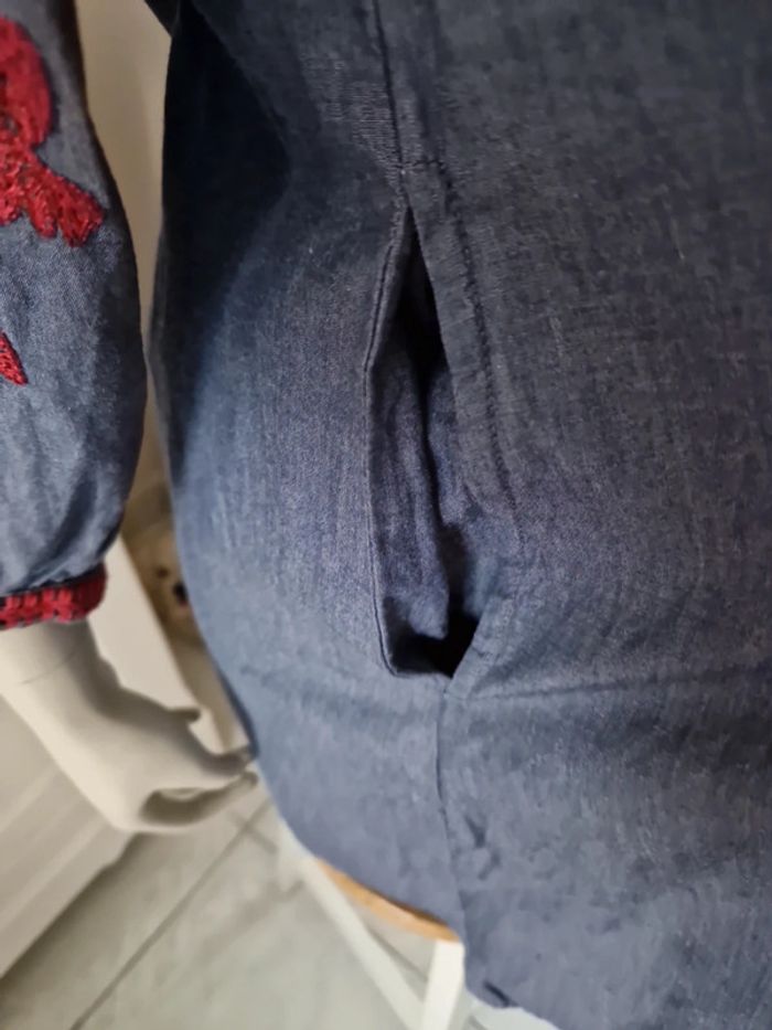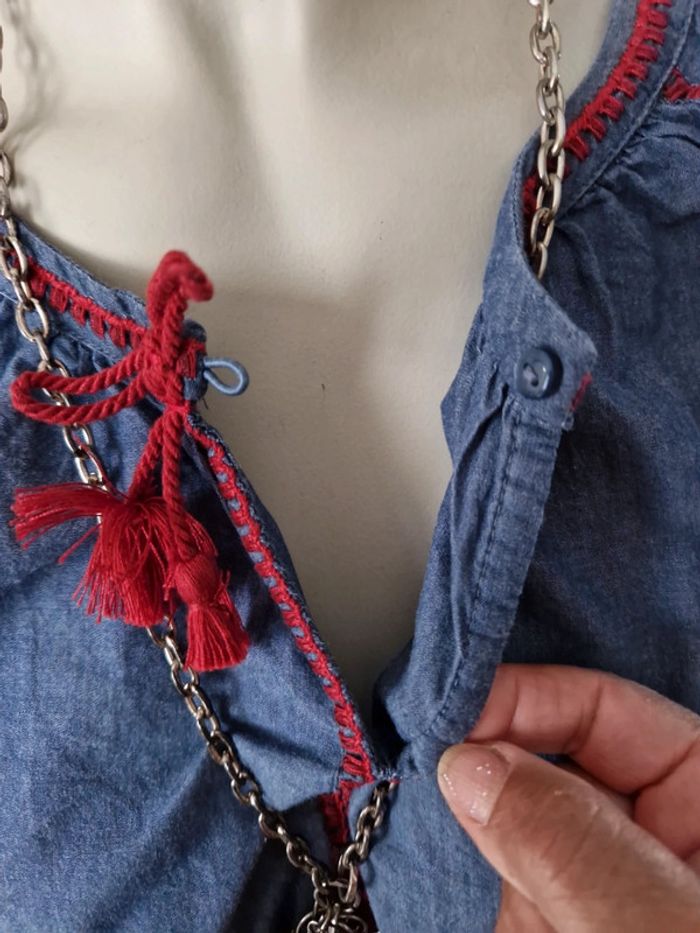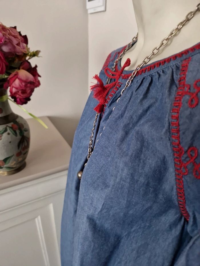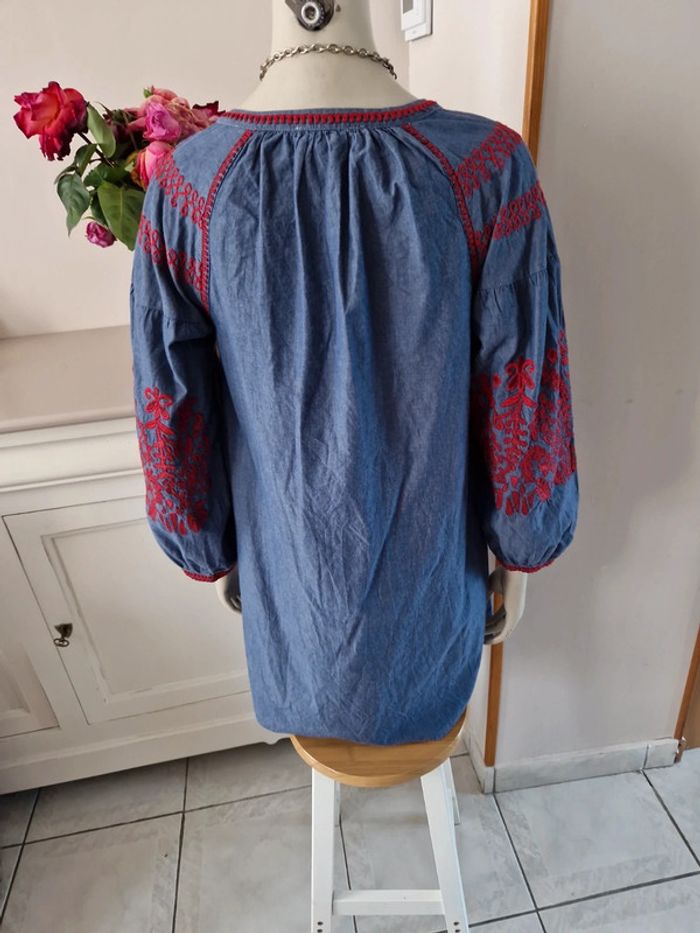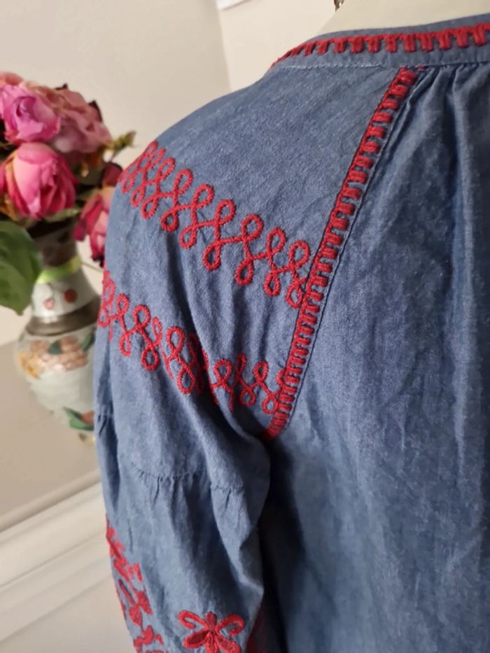 jolie robe ample avec de superbes broderies rouges sur les manches a l'encolure et au décolleté.