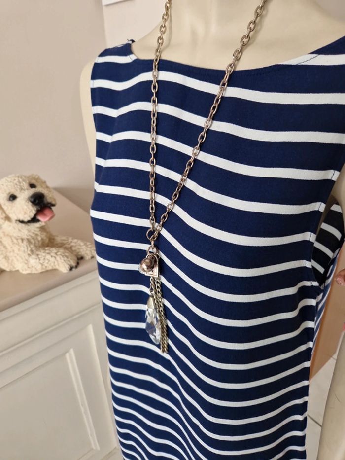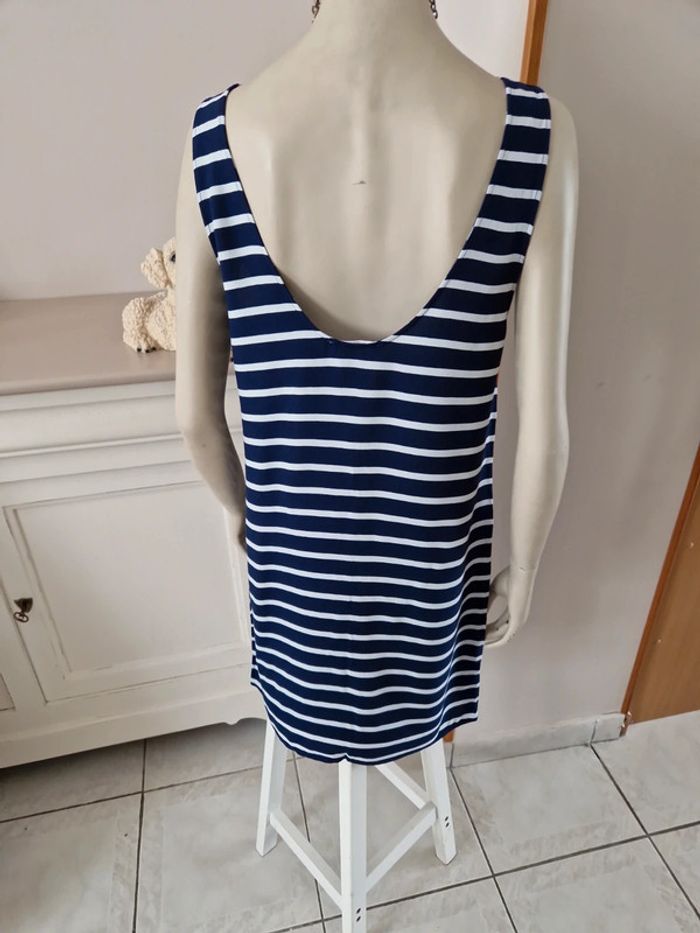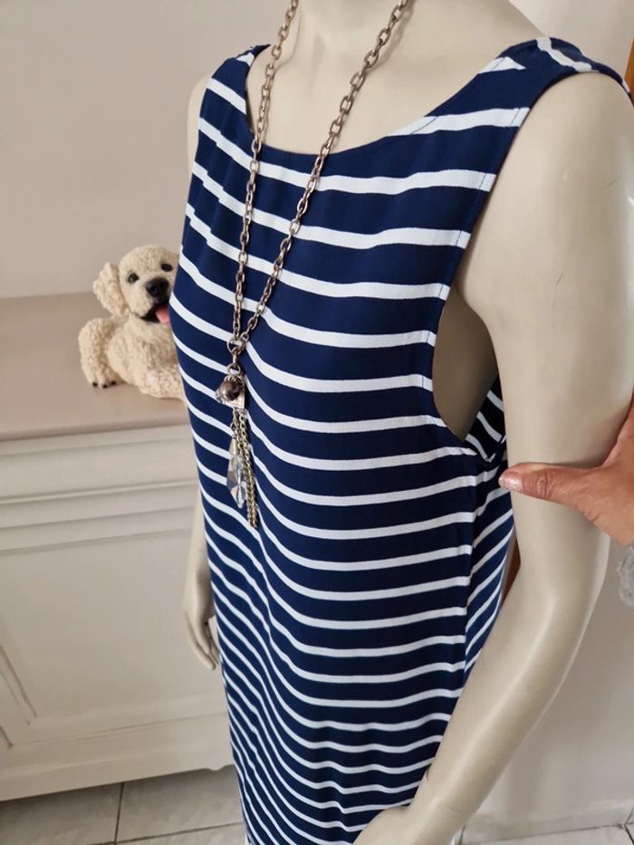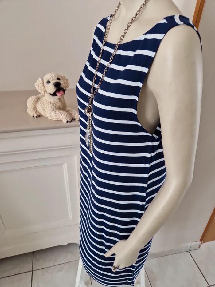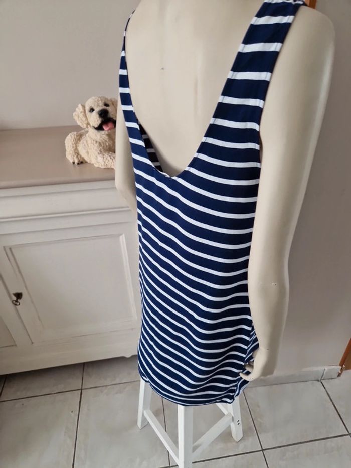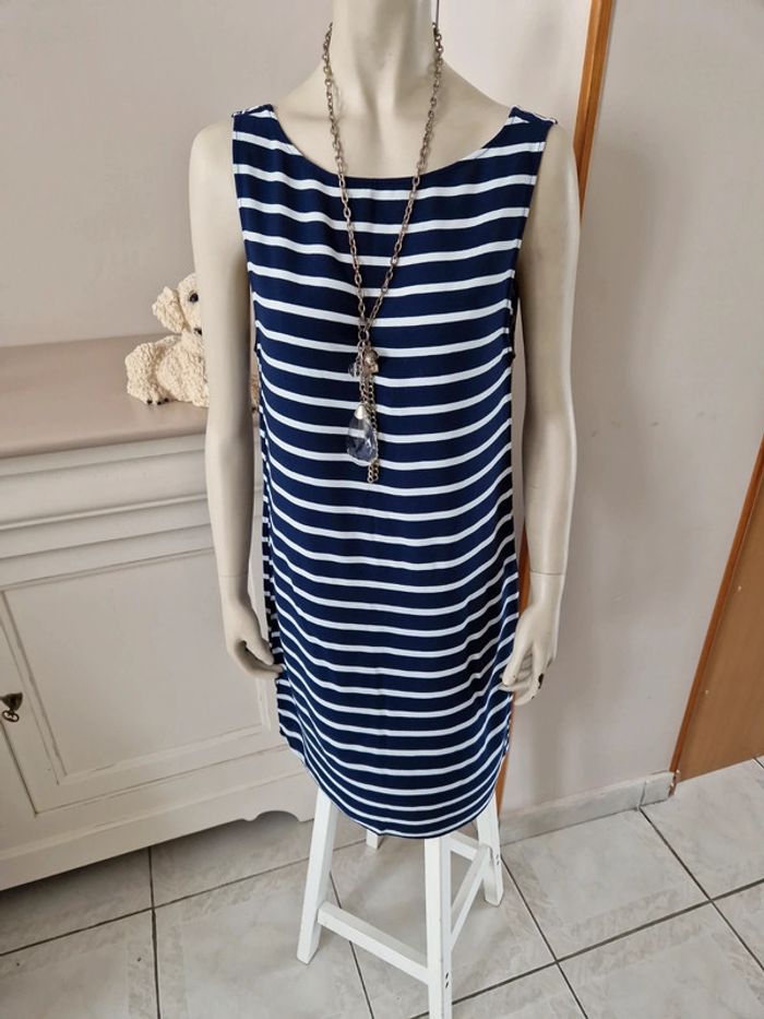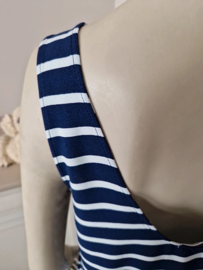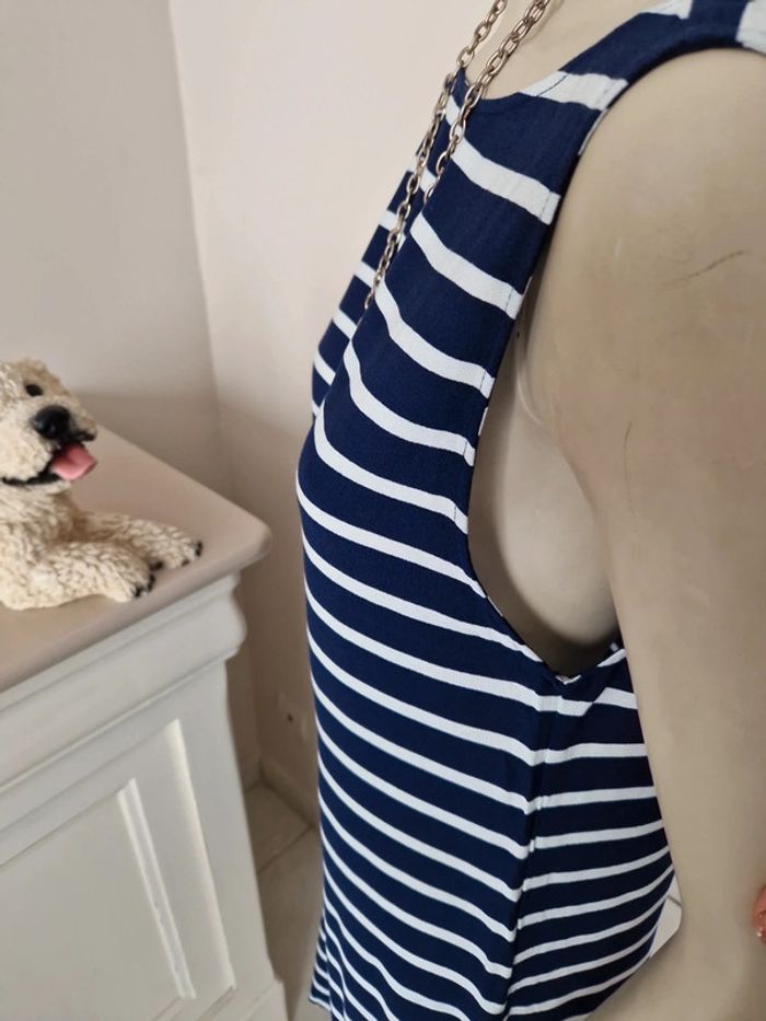 Jolie robe d'été à rayures sans manches. Décolleté en arrondi devant et en V plongeant dans le dos. Simple et belle cette robe. Matière coton et polyester #ellaben_robes