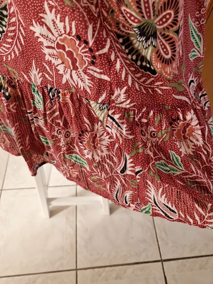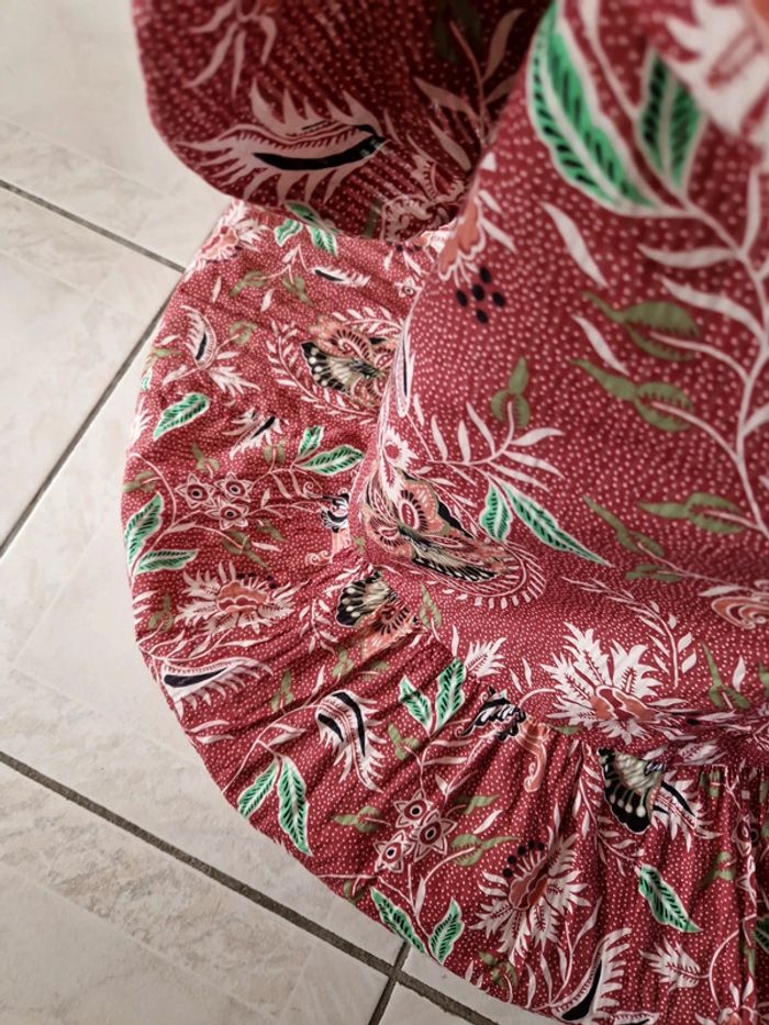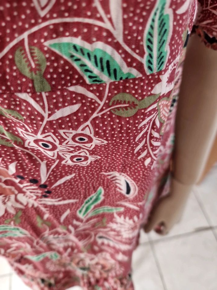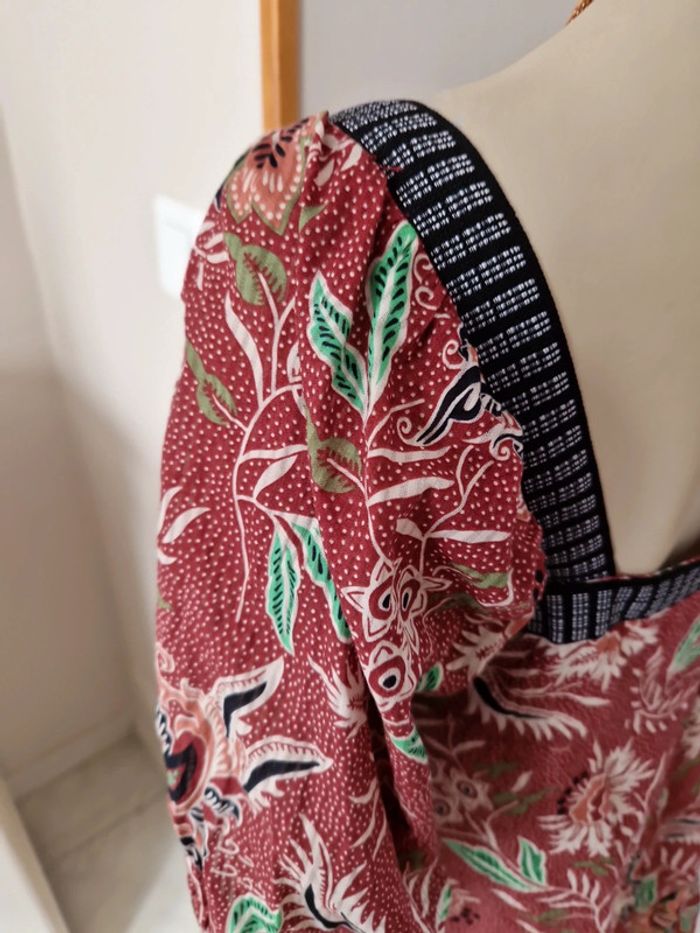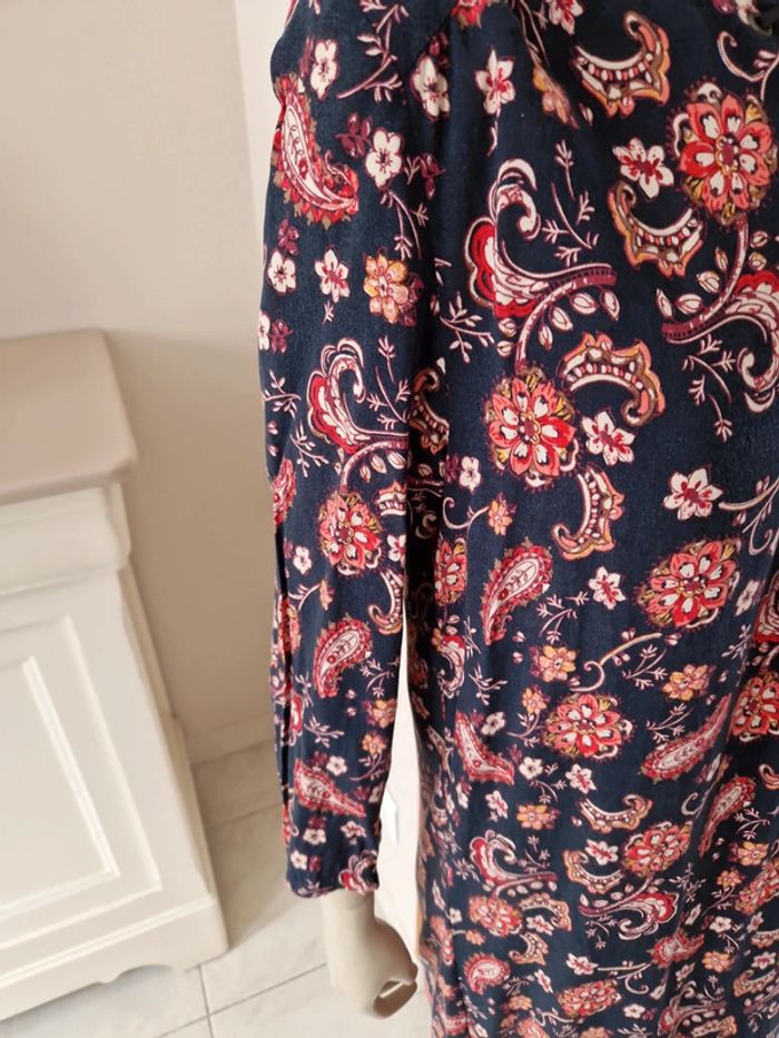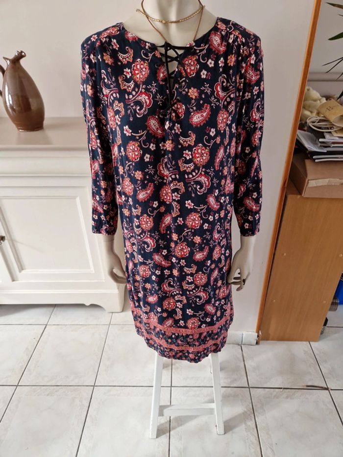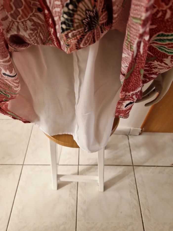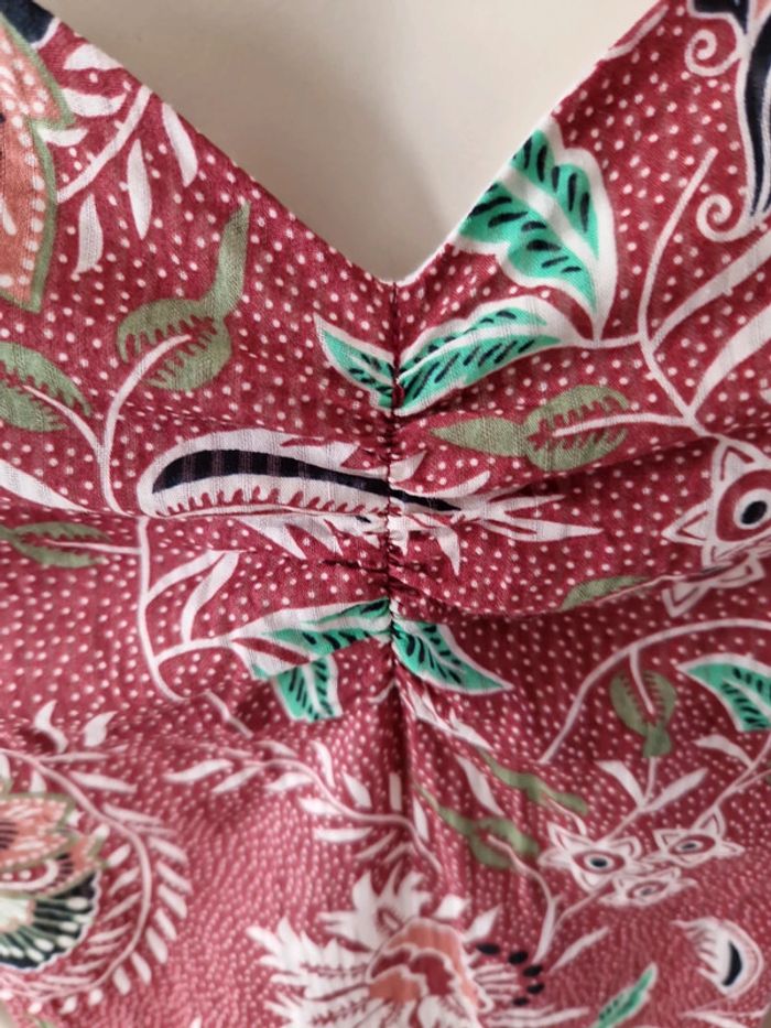Robe décolletée en V devant avec un jeu de plis et en carré derrière. Manches courtes à l'extrémité élastique. Décolleté bordé d'un tissu noir. Grand volant en bas de la robe. Robe entièrement doublée. Tissus 100% coton. Taille 36 mais elle est plus grande. Robe Cache Cache Mesures aisselles :46cm #ellaben_robes Robe droite Camaieu motifs floraux. Manches trois quarts. Fermeture par un cordon en cuir.Robe légère. Mesures aisselles :49cm taille 38 Les réductions sont activés sur les lots alors hésitez pas à consulter mes autres annonces et à faire des lots.