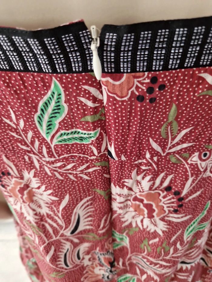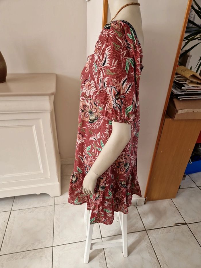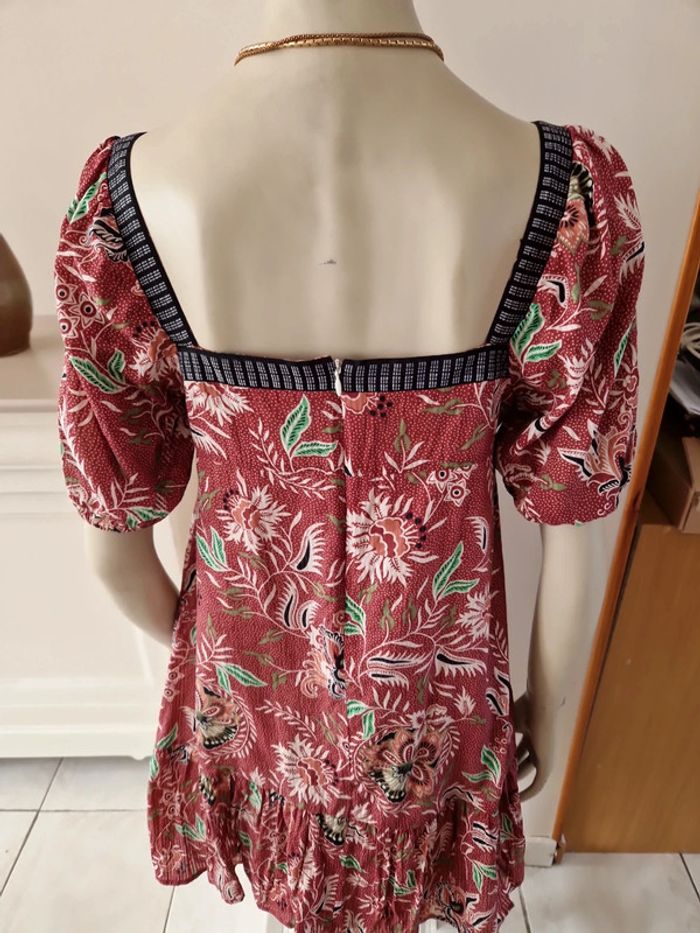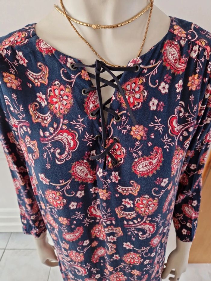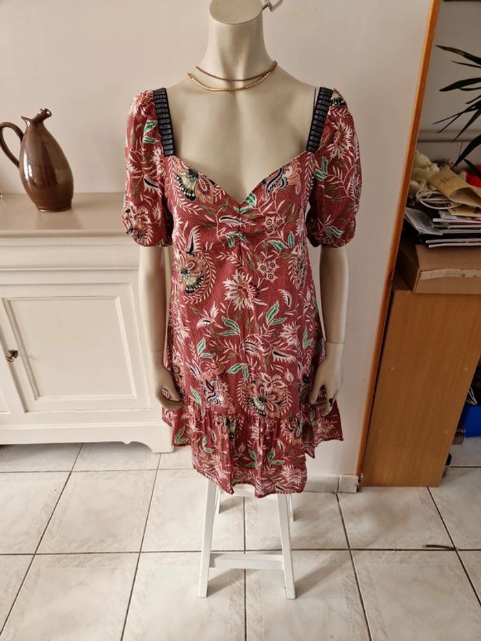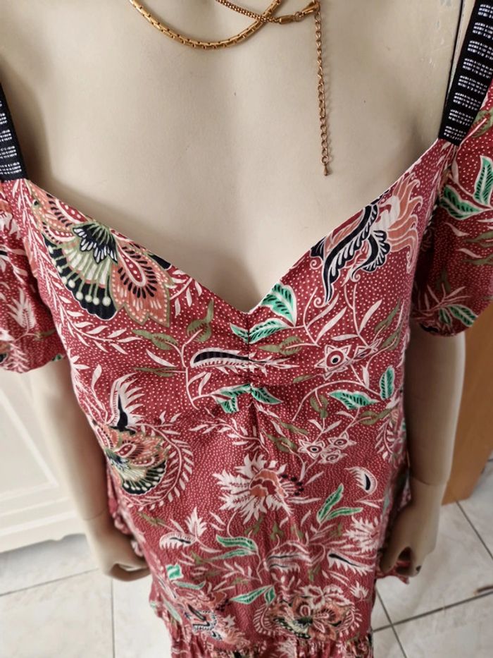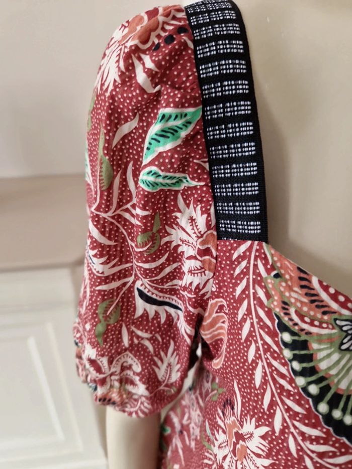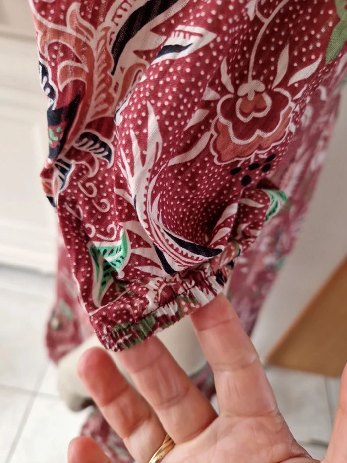 Robe décolletée en V devant avec un jeu de plis et en carré derrière. Manches courtes à l'extrémité élastique. Décolleté bordé d'un tissu noir. Grand volant en bas de la robe. Robe entièrement doublée. Tissus 100% coton. Taille 36 mais elle est plus grande. Robe Cache Cache Mesures aisselles :46cm #ellaben_robes Robe droite Camaieu motifs floraux. Manches trois quarts. Fermeture par un cordon en cuir.Robe légère. Mesures aisselles :49cm taille 38 Les réductions sont activés sur les lots alors hésitez pas à consulter mes autres annonces et à faire des lots.