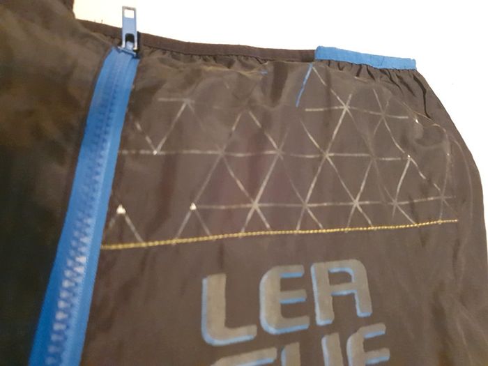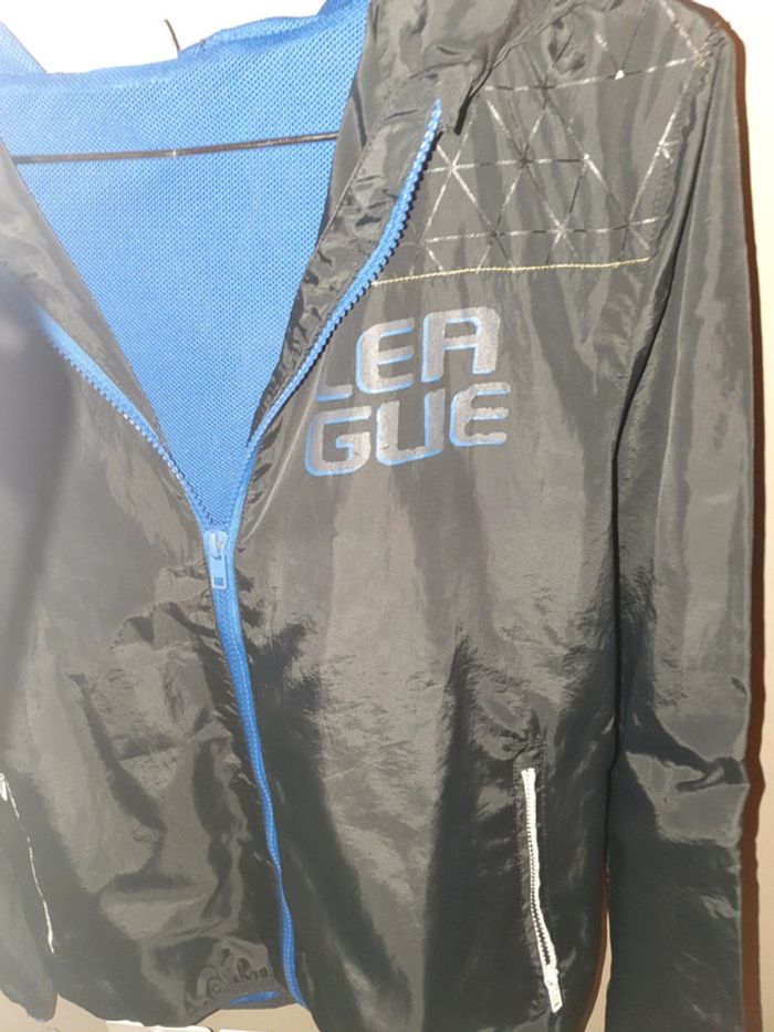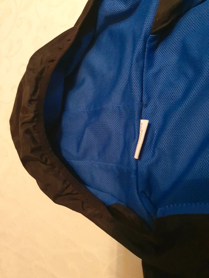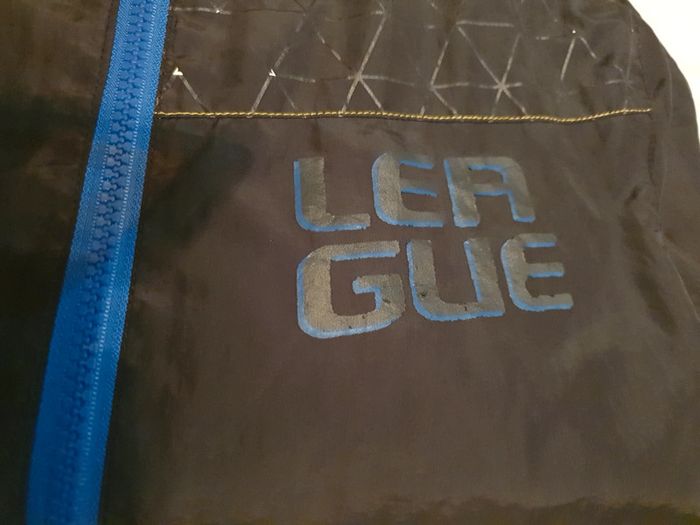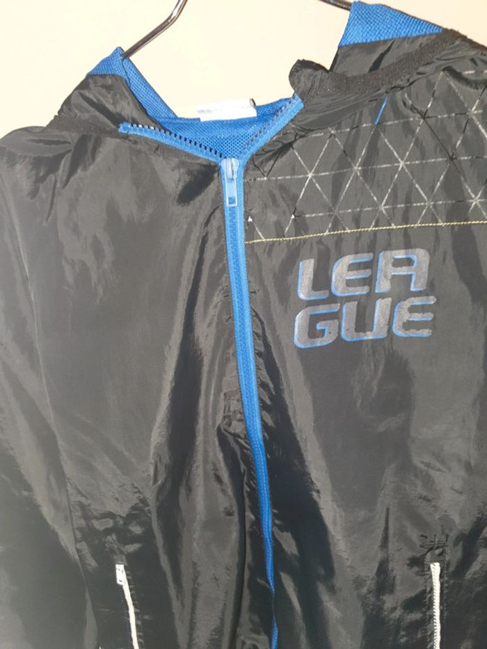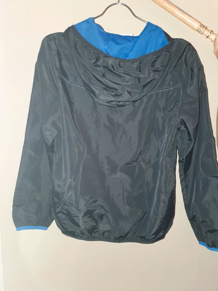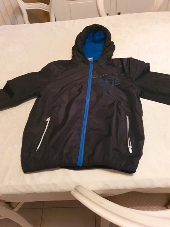 Coupe vent pour garçon de couleurs noir et bleu pétrole. Capuche et deux poches latérales avec fermeture éclair. Fermeture éclair centrale bleue. Tissus intérieur spécifique anti transpirant . Motifs géométriques ton sur ton sur le haut du blouson . #ellaben_vestesenfants #ellaben_enfants