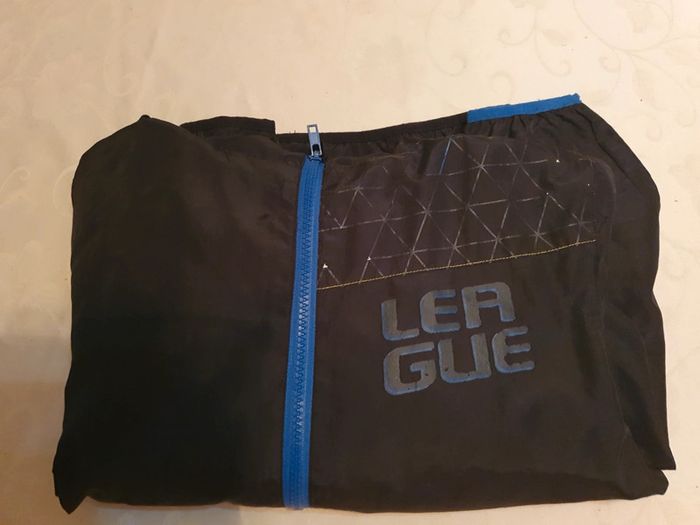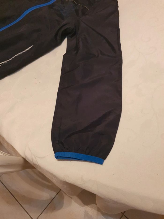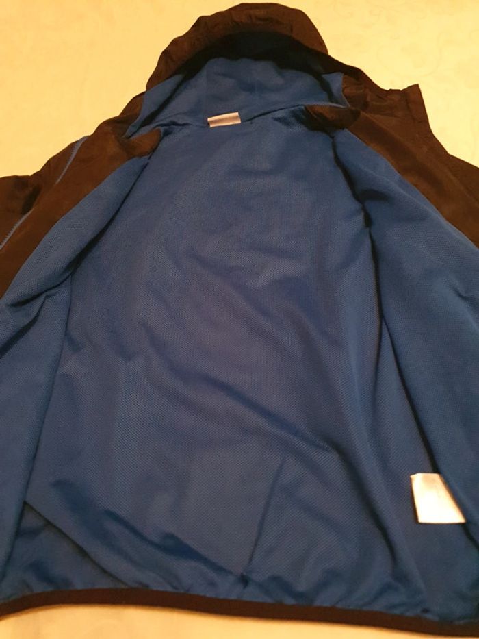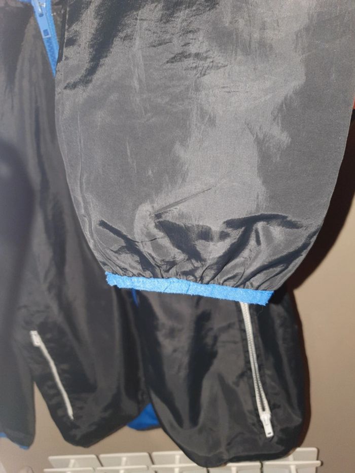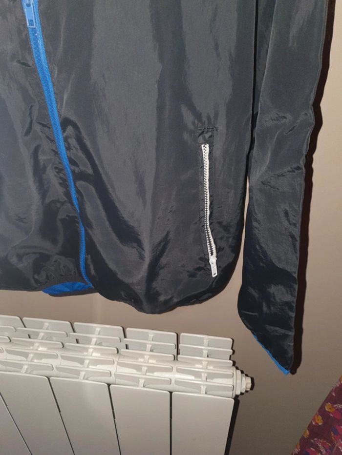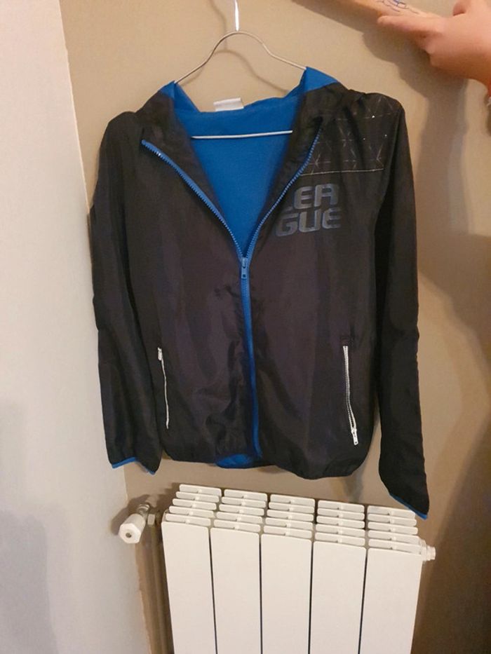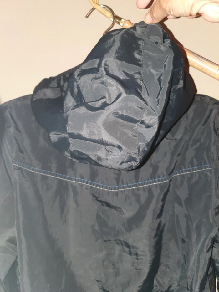 Coupe vent pour garçon de couleurs noir et bleu pétrole. Capuche et deux poches latérales avec fermeture éclair. Fermeture éclair centrale bleue. Tissus intérieur spécifique anti transpirant . Motifs géométriques ton sur ton sur le haut du blouson . #ellaben_vestesenfants #ellaben_enfants