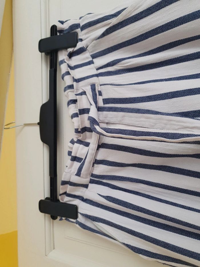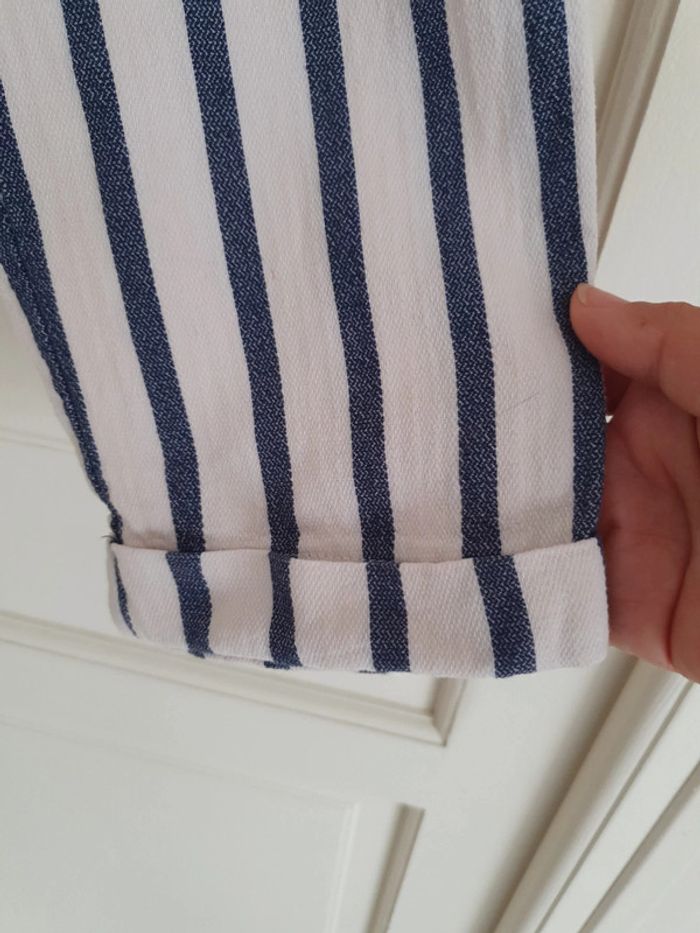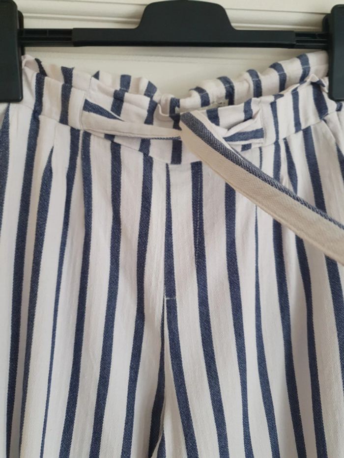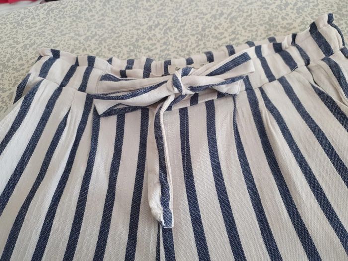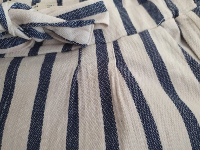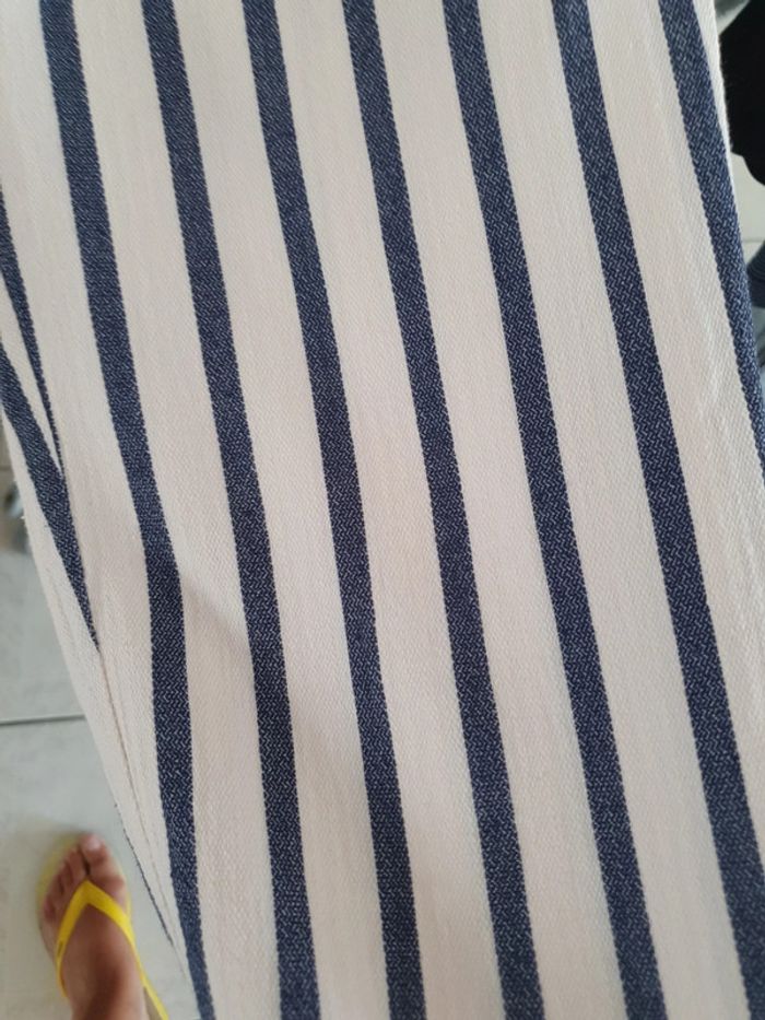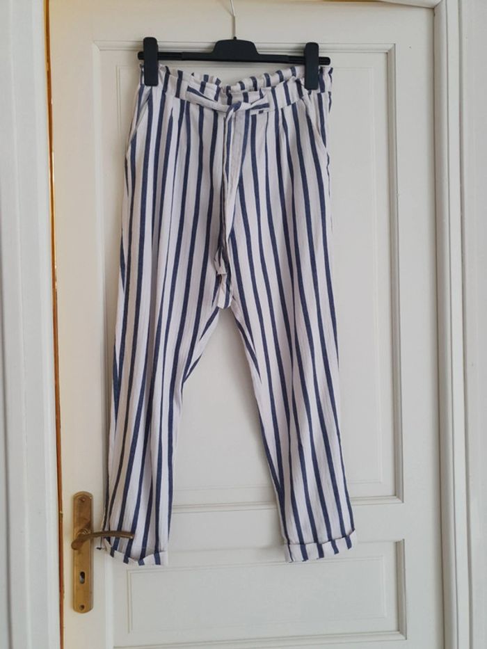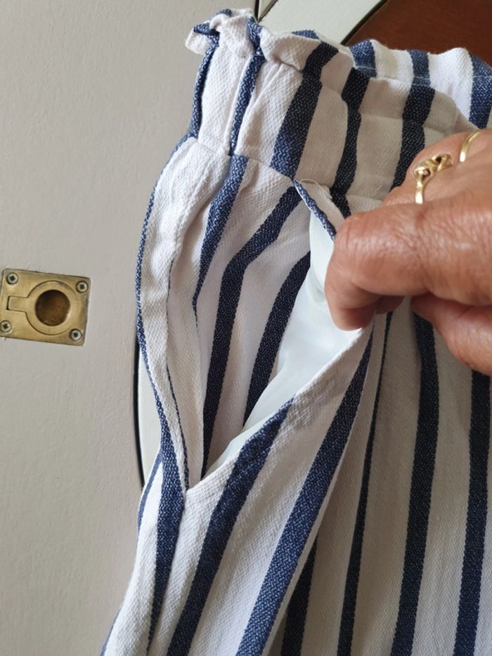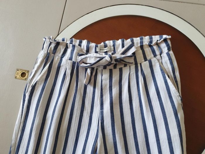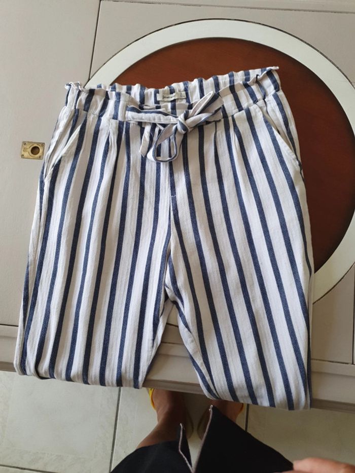 Joli pantalon taille haute de marque Stradivarius. La taille est élastique avec une ceinture pour ajuster selon sa corpulence. Deux poches latérales. Un petit ourlet au bout des jambes. Très léger et agréable à porté pendant la belle saison. Rayures bleues et blanches. Composition du tissus 61% coton 39% viscose #ellaben_pantalonfemme