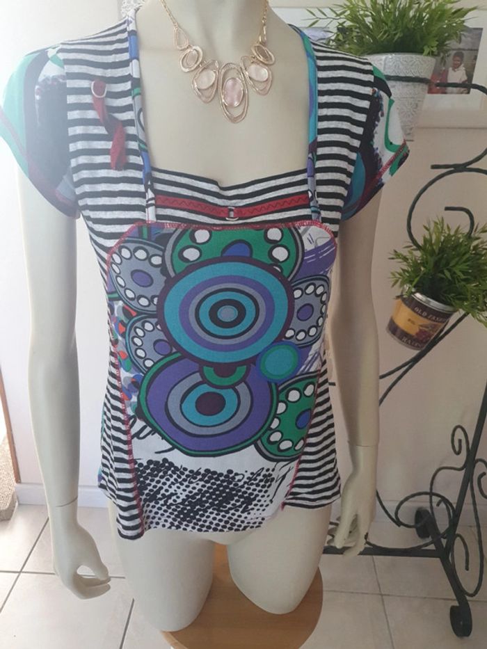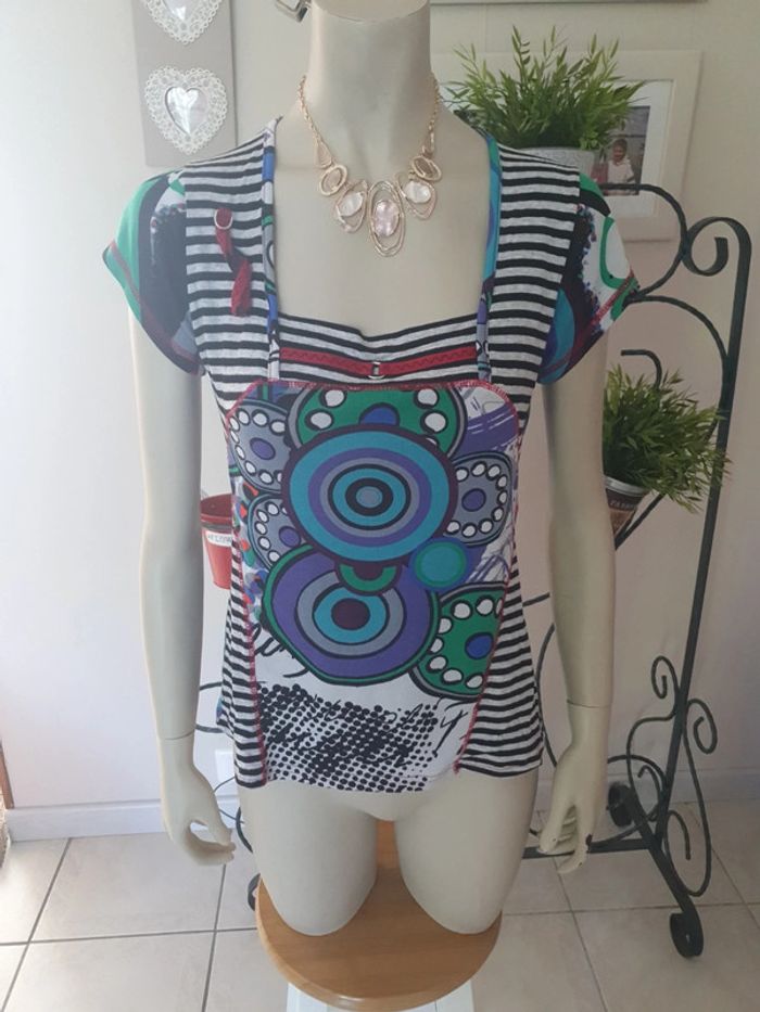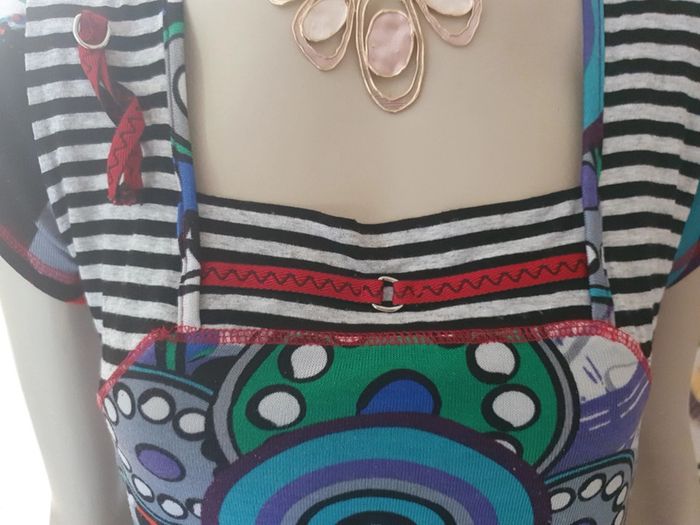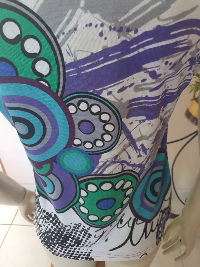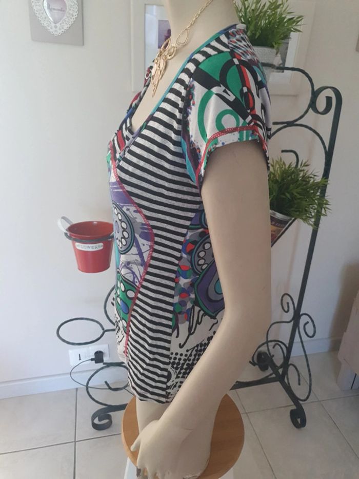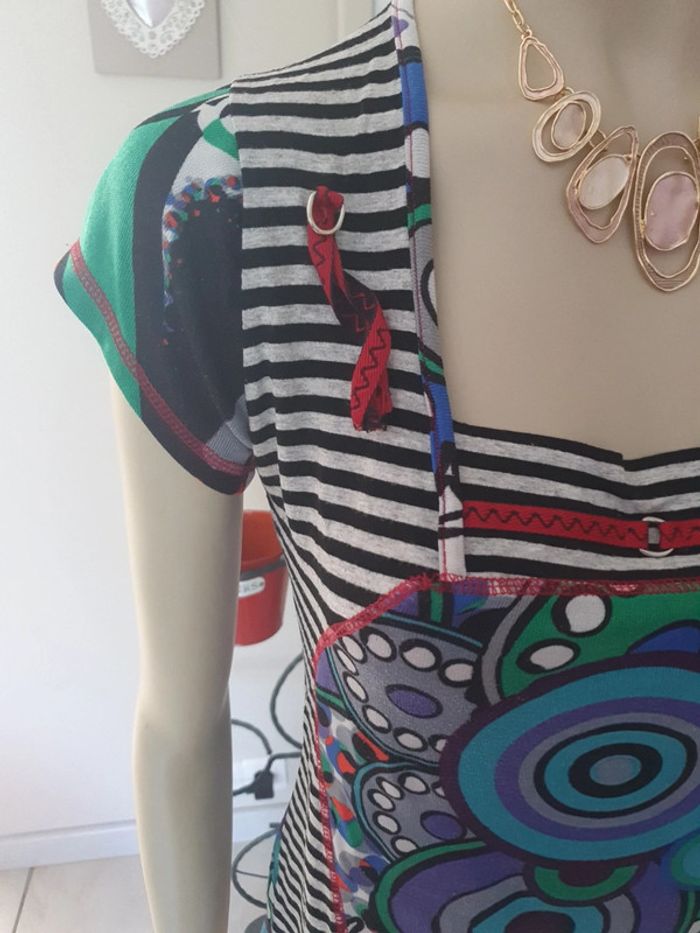 Tchirt manches courtes avec un décolleté style bateaux. Petite fantaisie sur le haut avec un petit ruban rouge,ruban que l'ont retrouve également sur le décolleté. Motifs très colorés. #ellaben_tchirtfemme #ellaben_pullsfemme