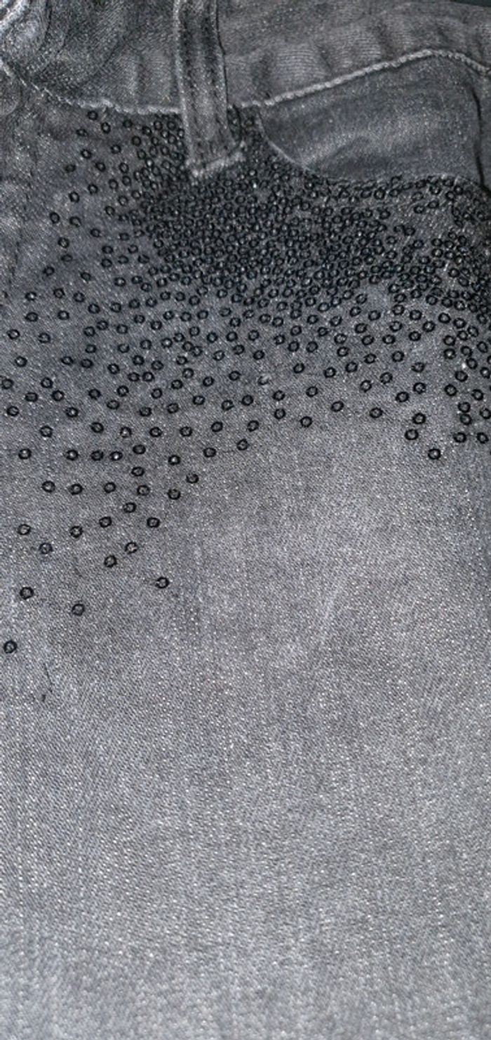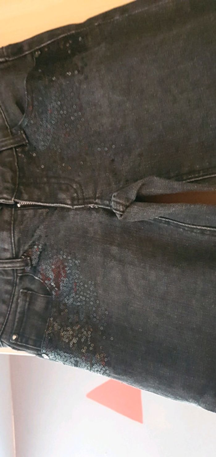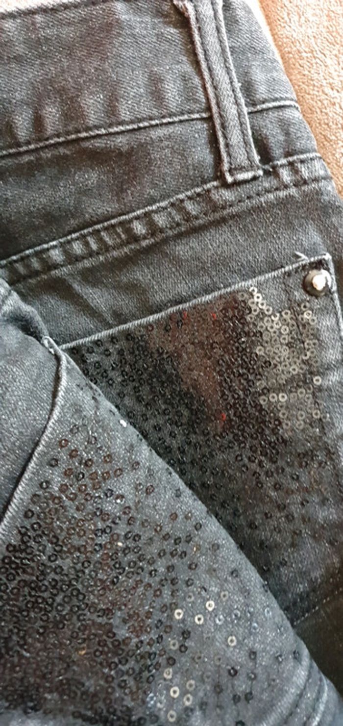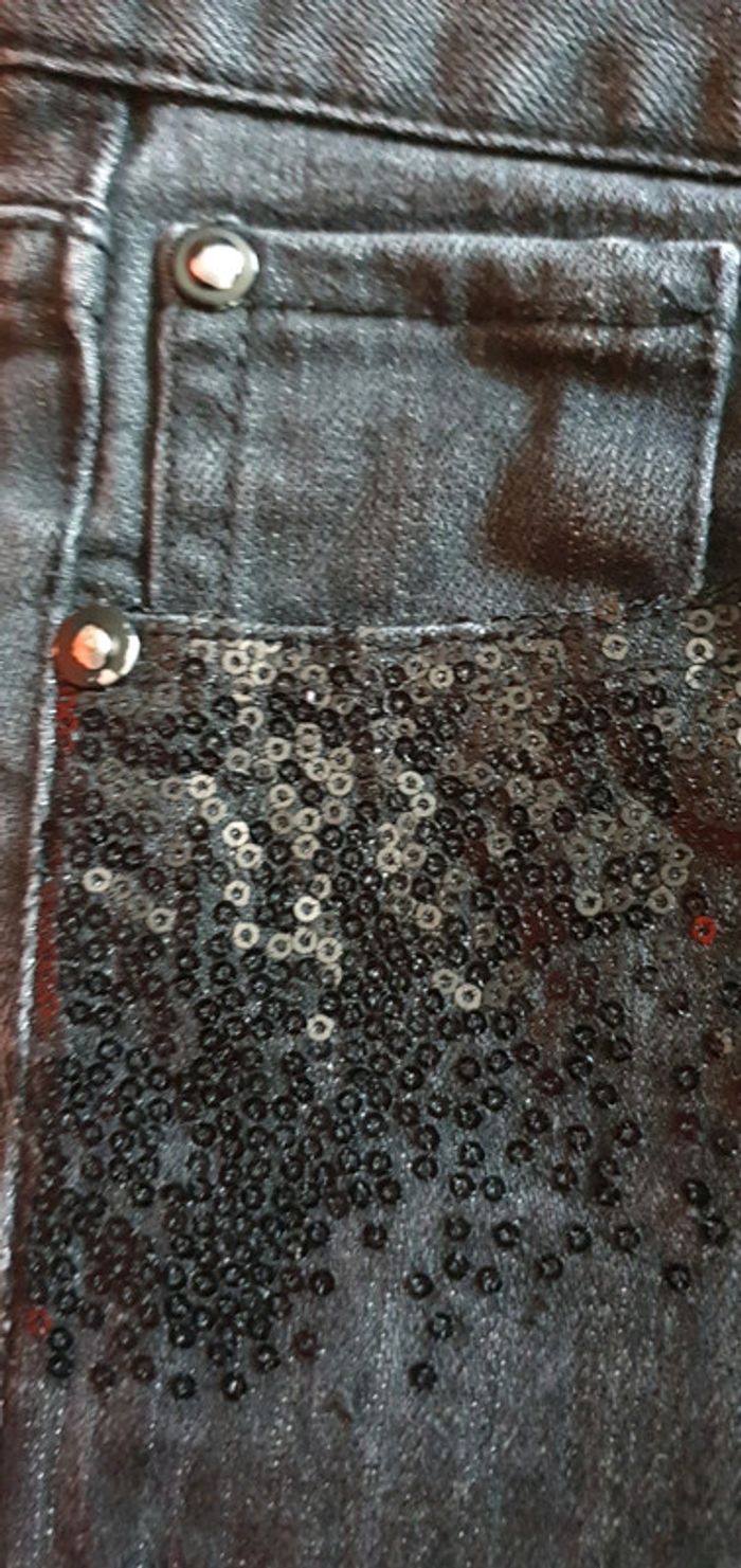 Jeans femme original avec des sequins noir ⚫ brillant semés sur les quatres poches. Fermeture et boutons devant. Quatres poches plaqués. Modèle peu courant et original avec ces sequins. Jeans qui as un côté décontracté et chic. #ellaben_pantalonfemme