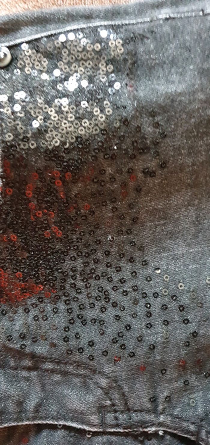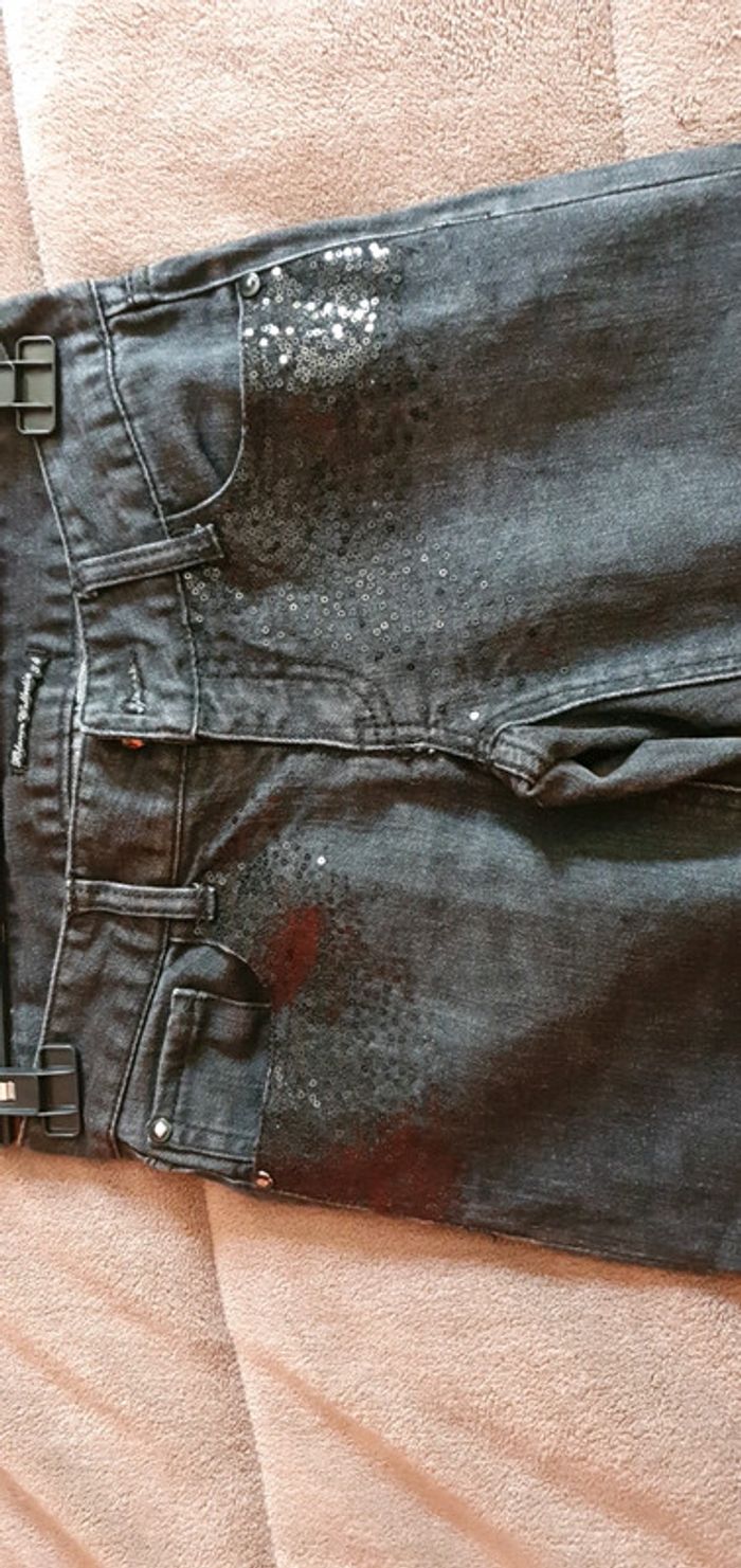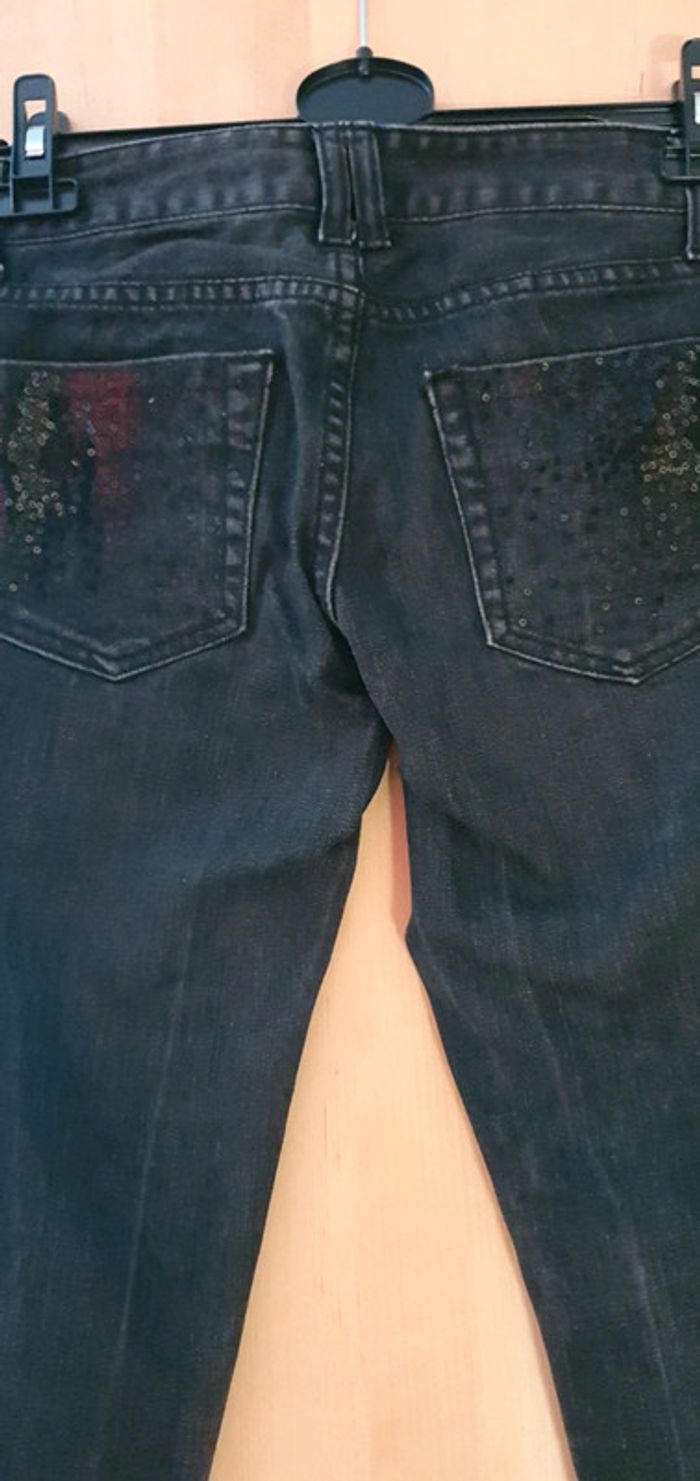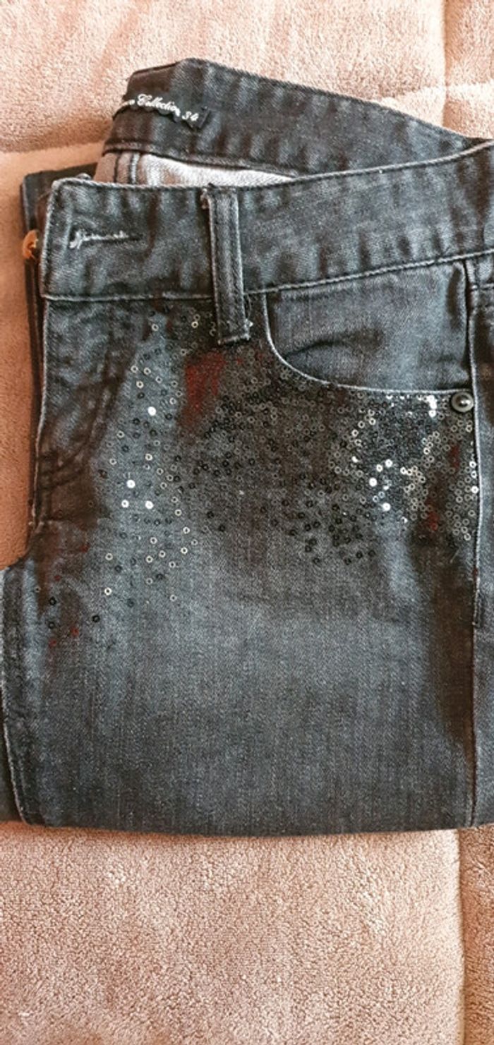 Jeans femme original avec des sequins noir ⚫ brillant semés sur les quatres poches. Fermeture et boutons devant. Quatres poches plaqués. Modèle peu courant et original avec ces sequins. Jeans qui as un côté décontracté et chic. #ellaben_pantalonfemme