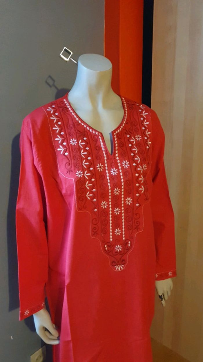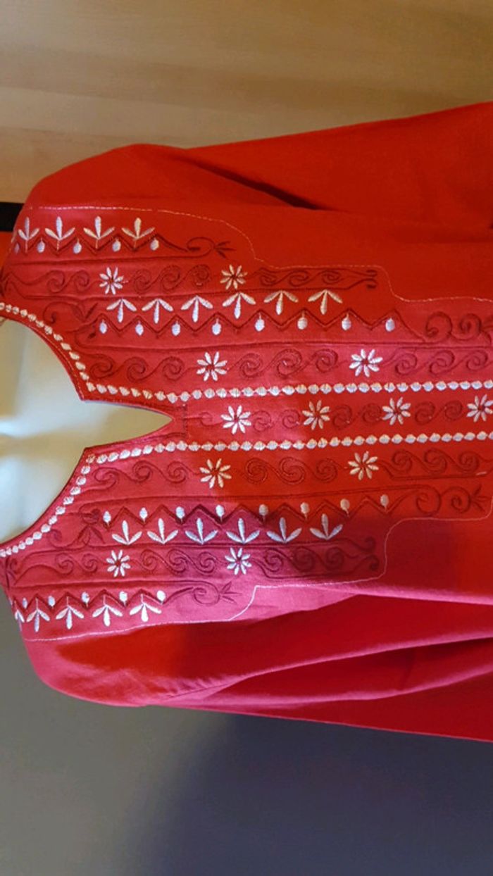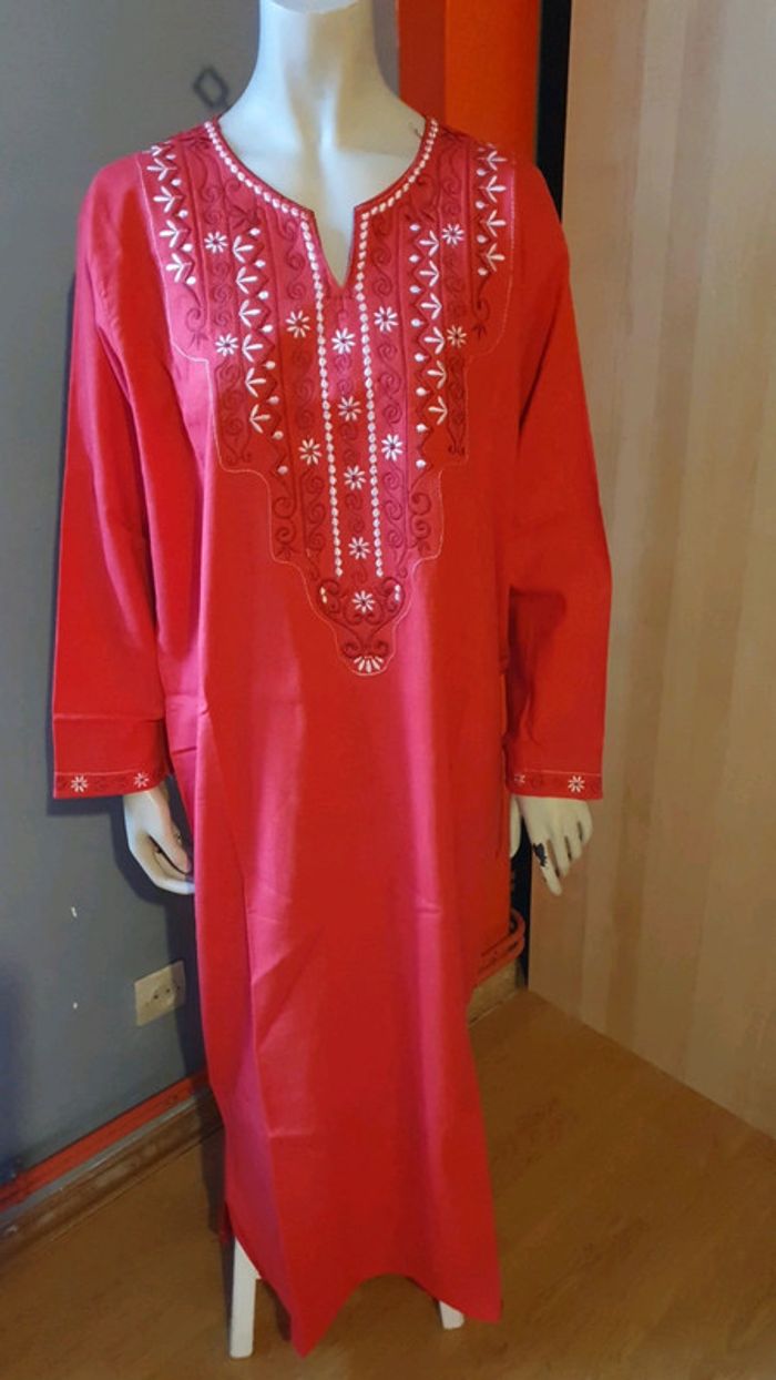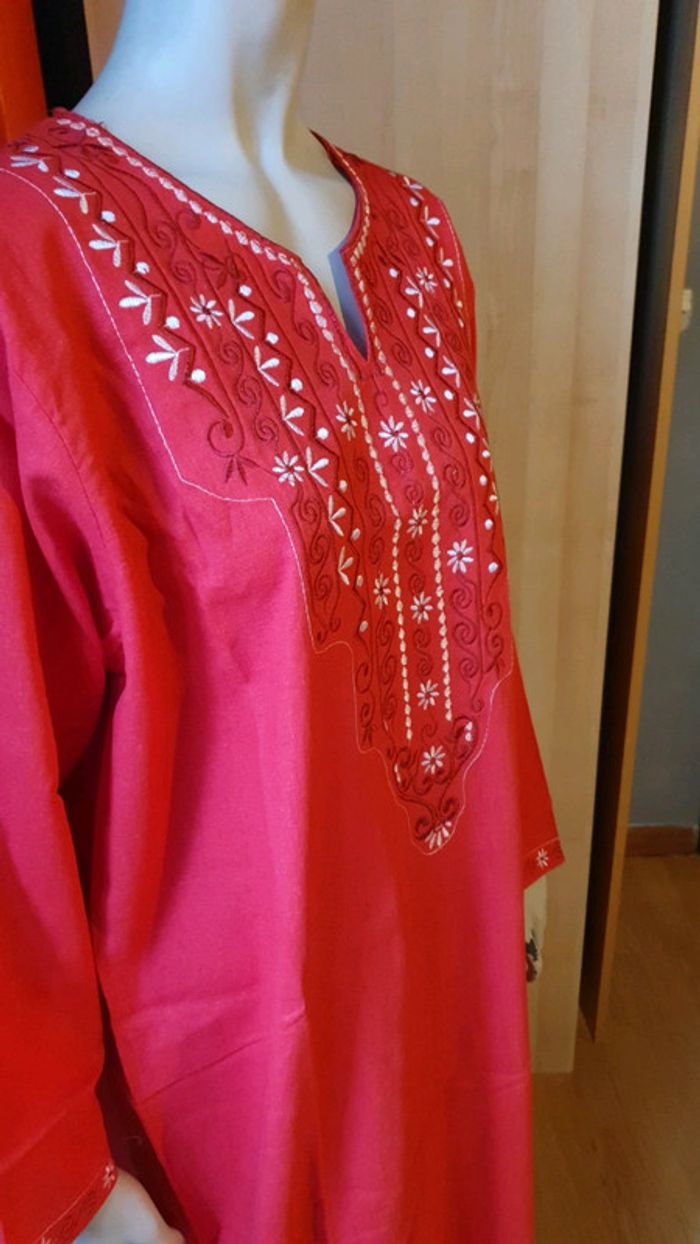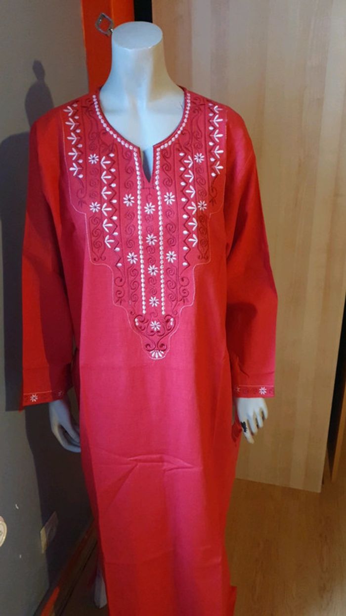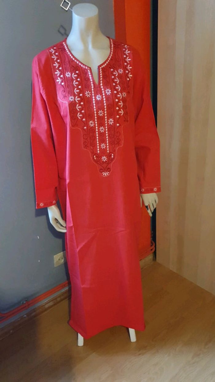 Jolie djellaba neuve de couleurs rouge avec motifs floraux sur la poitrine. Petit décolleté en V. Manches longues brodées au bout . Deux fentes sur les cotés en bas du vêtement . 100%coton très agréable à porté. Hésitez pas à consulter mes autres annonces. #ellaben_robeskabyle #ellaben_vetementstraditionnel