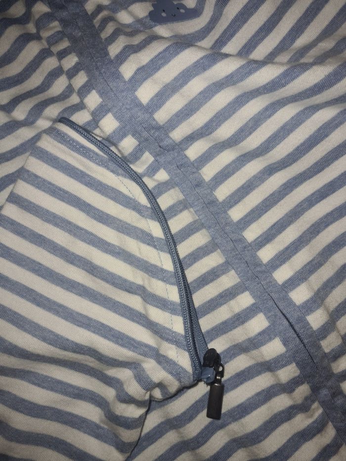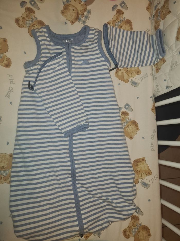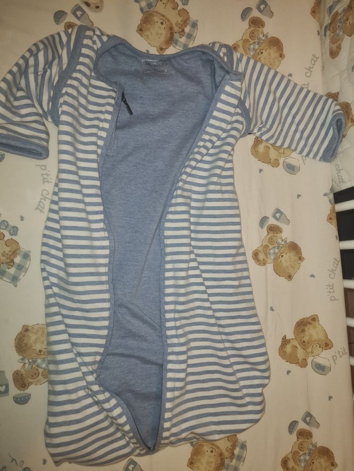 Taille 1 Prix orchestra 29.99 Prix club 23.99 Servis 1 seul bébé et très peu car bébé né fin avril et vit dans le Sud. Jamais mis les manches. Turbulette rayée en jersey. Manches amovibles. Encolure ronde. Print nuage sur la poitrine. Ouverture zippée inversée sur le devant pour la sécurité de Bébé. Protection anti-pincements au col.