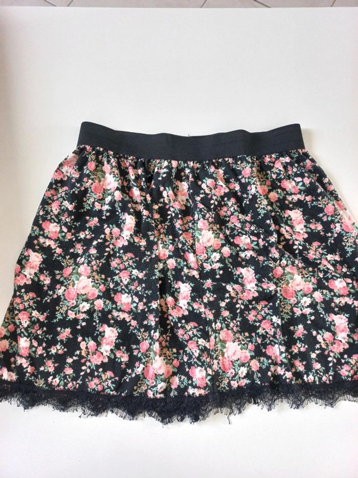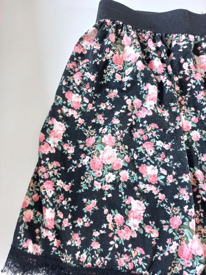 Jupe noir fleuri, correspond à un 38 très bon état, taille élastique, mesure de la taille en photo #cbtaille38