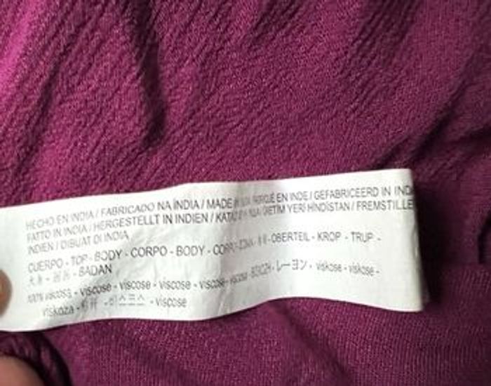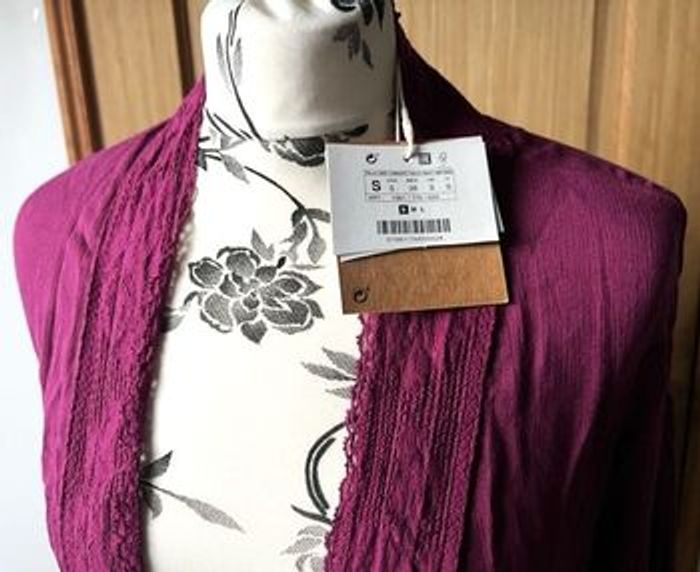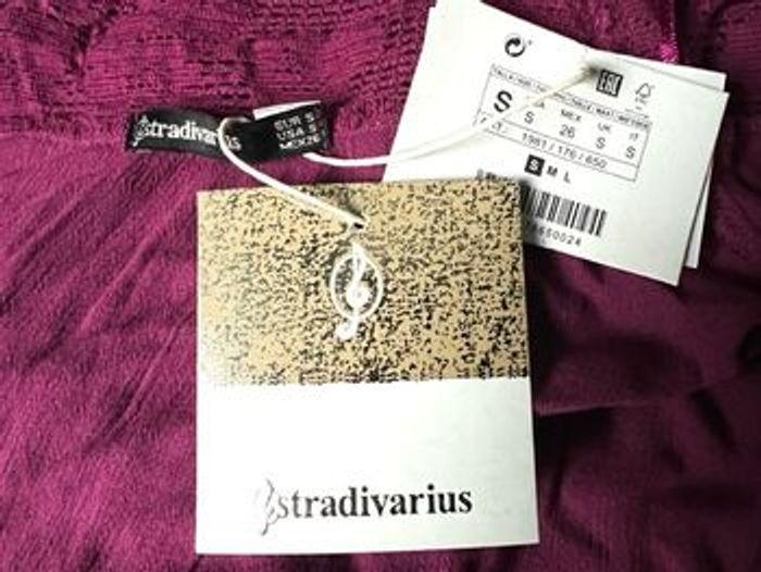 Marque "Stradivarius". couleur vieux rose/prune/violet. Manches 3/4, longue fente de chaque côté. Tour poitrine 112 cm, longueur 117 cm.