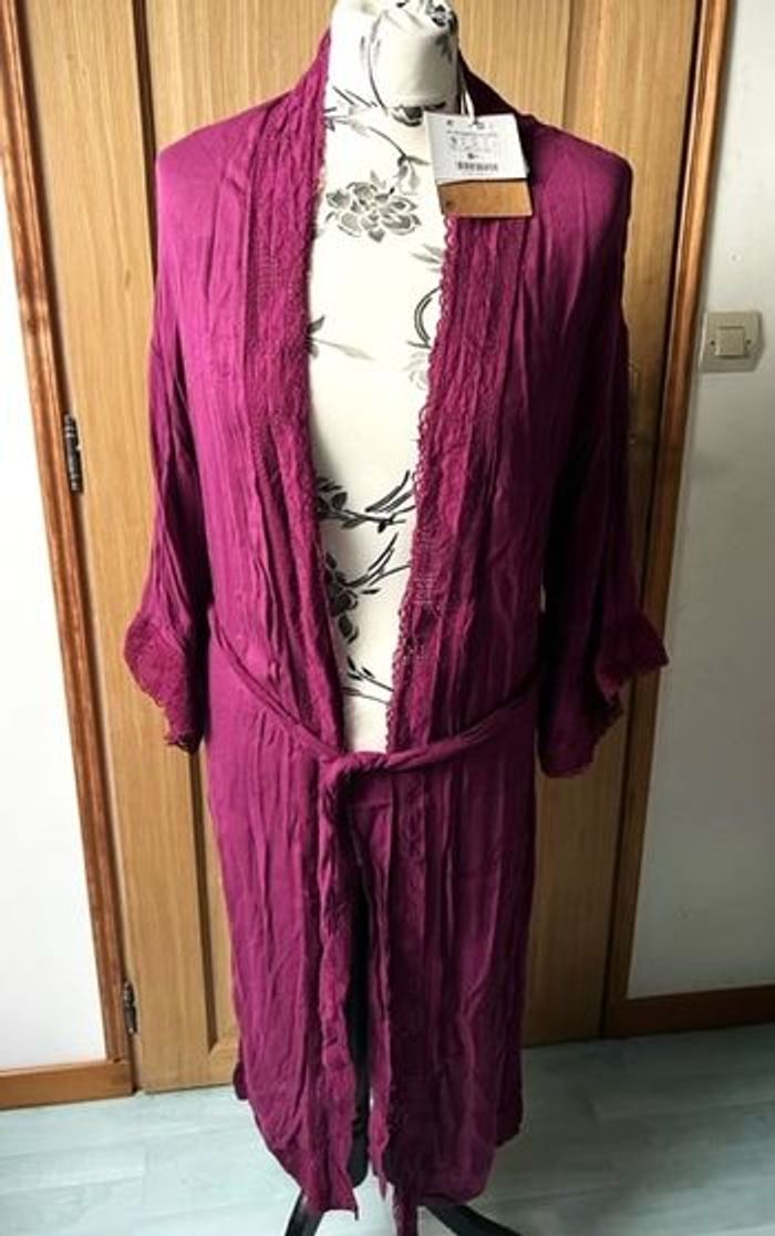 Kimono long vieux rose/prune bordures dentelle macramé taille 36/38 - photo numéro 1