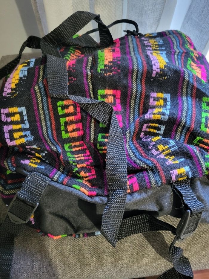Petit sac multicolore avec marqué Mexico. Il a des lanières pour le porter ds le dos. Il se sert avec une ficelle pour le fermer. Forme "bourse". Jamais servi