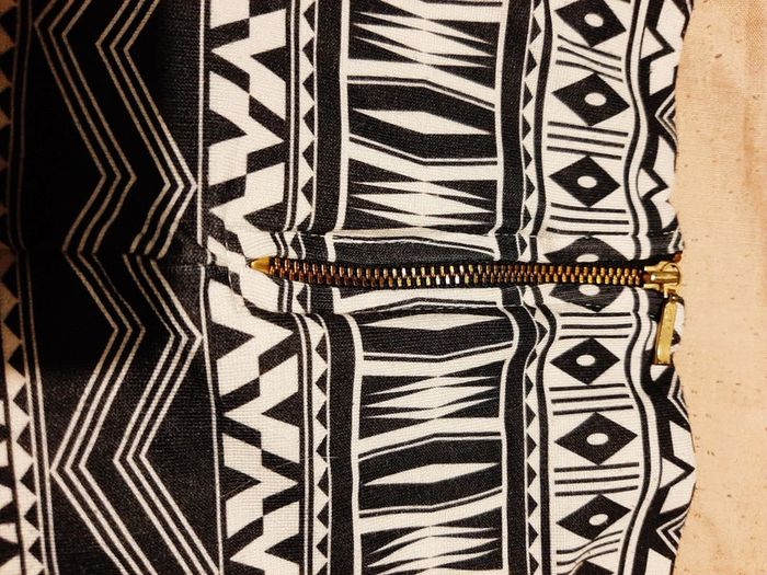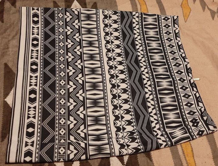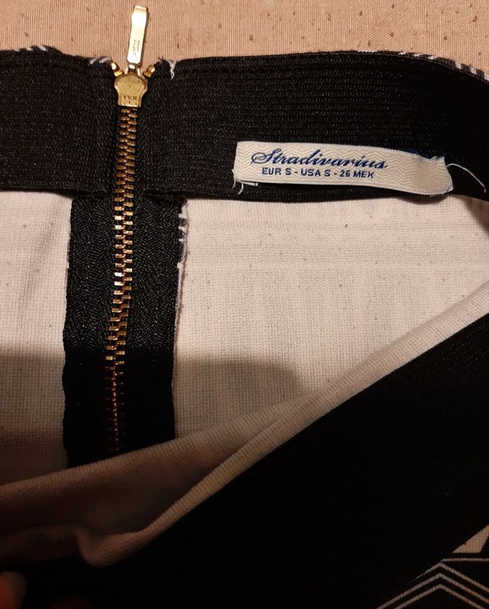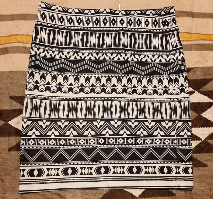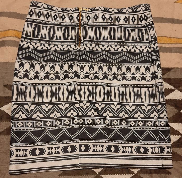 Jupe courte moulante, noire et blanche, avec des motifs ethnique. Très sympa, en très bon état. De la marque stradivarius, taille S. Avec fermeture éclair derrière pour faciliter l'habillage. N'hésitez pas à aller faire un tour dans mon dressing de nombreux autres articles à vendre à des tout petits prix et prix dégressif sur les lots 🌸je reste disponible pour toutes questions 🙂