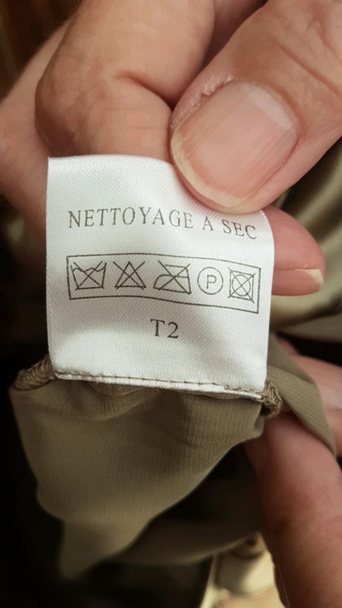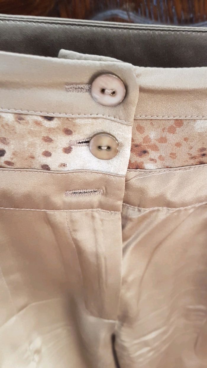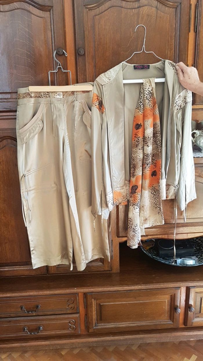 Porté 1 fois, intérieur soie, pantalon (taille 2) resserable mi cuisse, Veste très légère avec fermeture éclair (taille 1). 1 bouton manquant sur le pantalon. Possibilité de moduler avec jupe/T-shirt (voir second lot) ou vente à l'unité. Très léger pour l'éte, convient aussi en mi-saison ❤