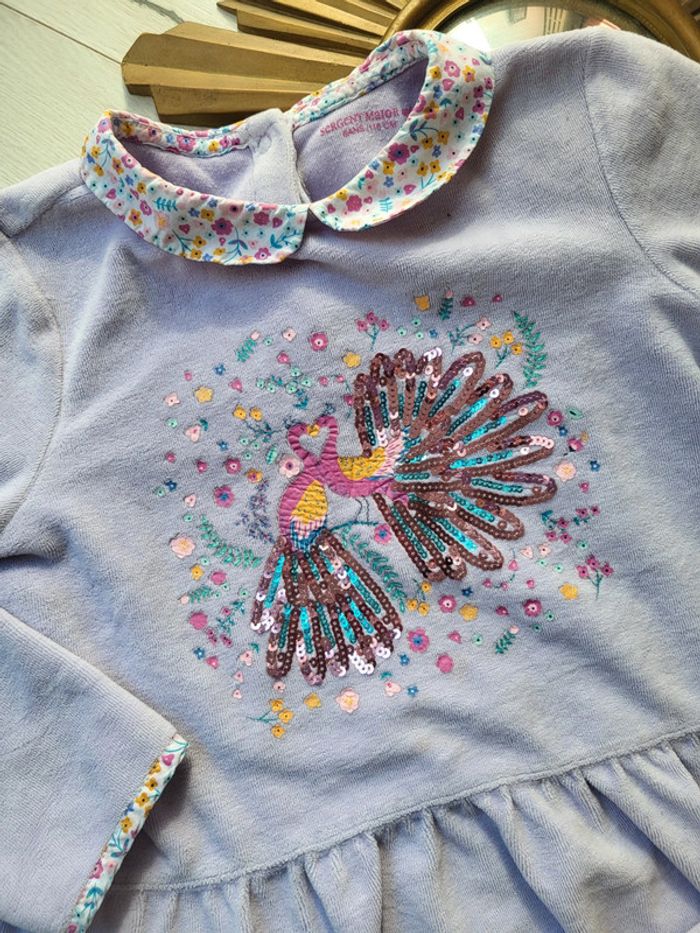 Excellent état. Taille 6ans. Motifs paons et fleurs paillettes. Coloris parme. Petit col et pressions. Tout doux. #6anstatiana #pyjama #velours #paon #paillettes #sergentmajor #6ans #pois