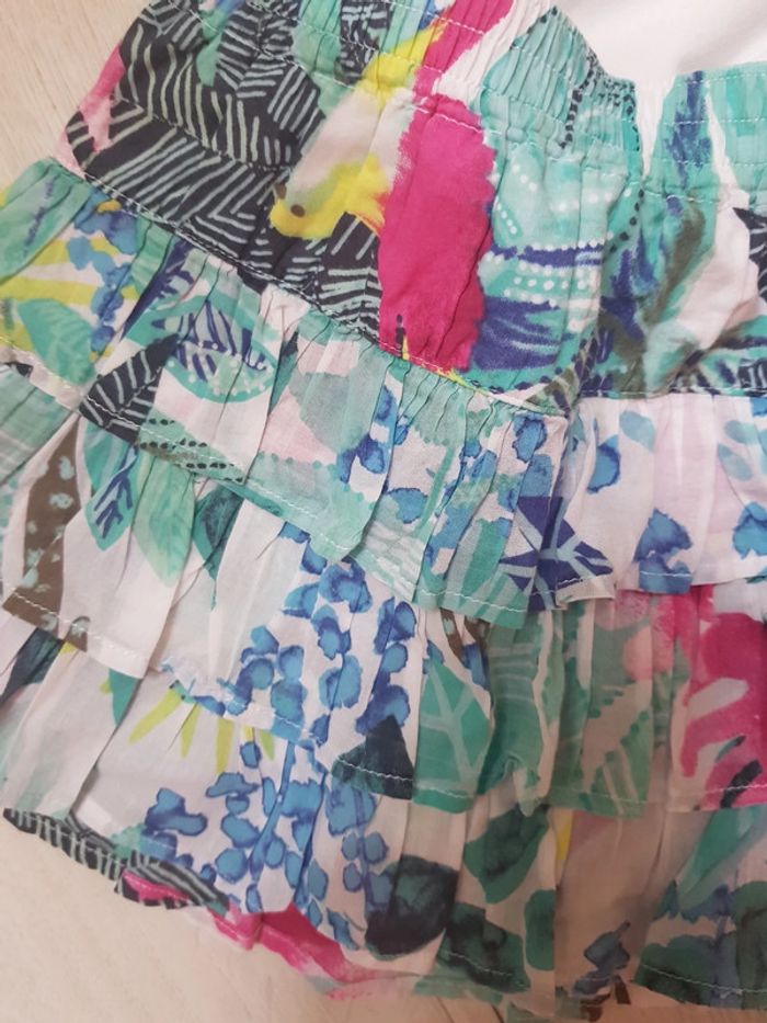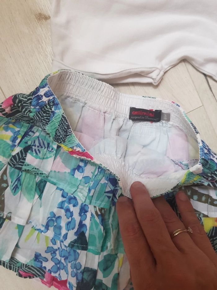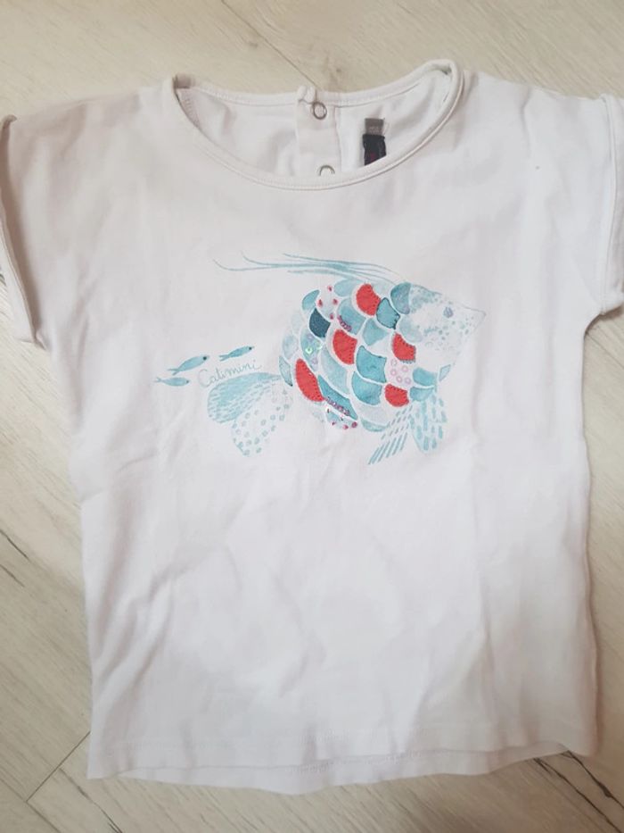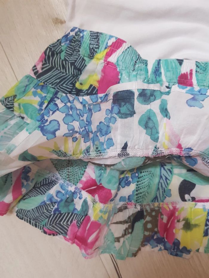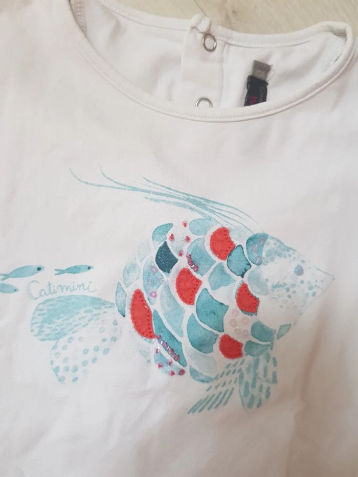 Excellent état. Catimini fille estival 3ans. Jupe à volants légère motifs fleurs oiseaux. Tee shirt motifs poisons. #3anstatiana #jupe #teeshirt #3ans #catimini #fleurs