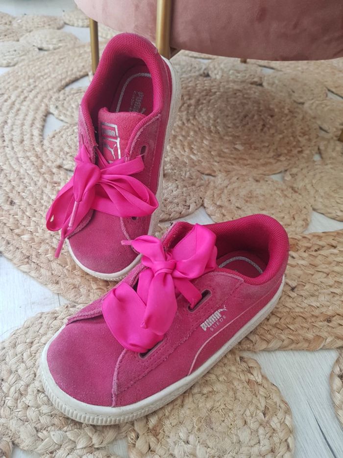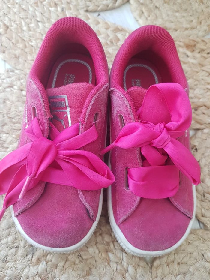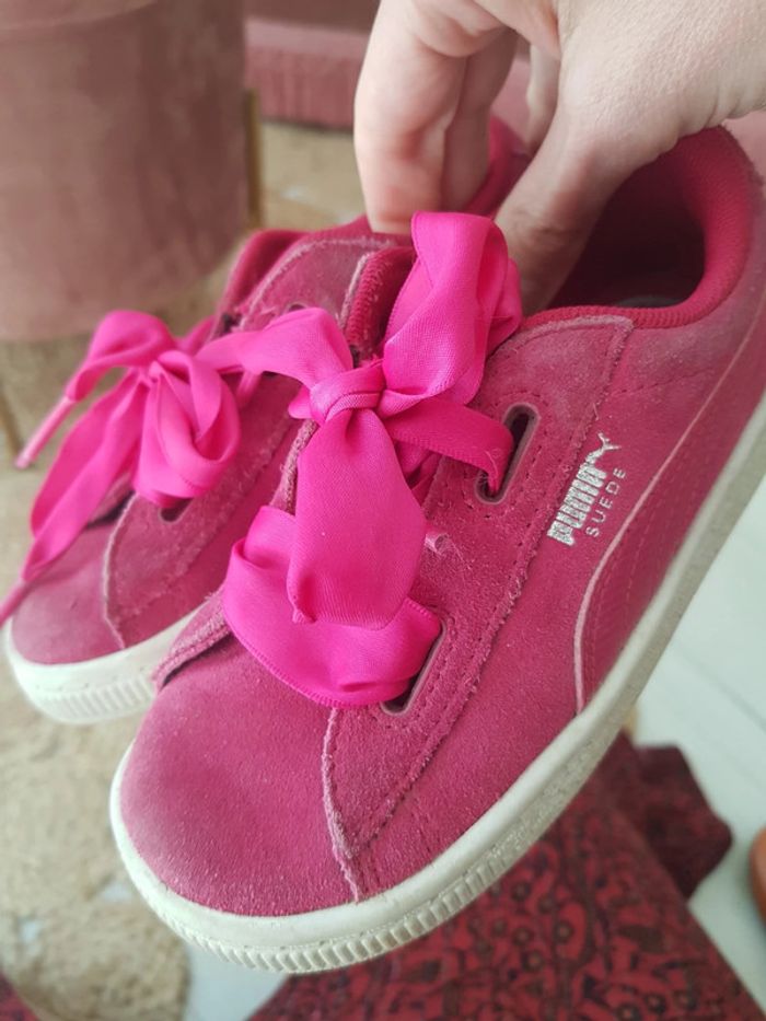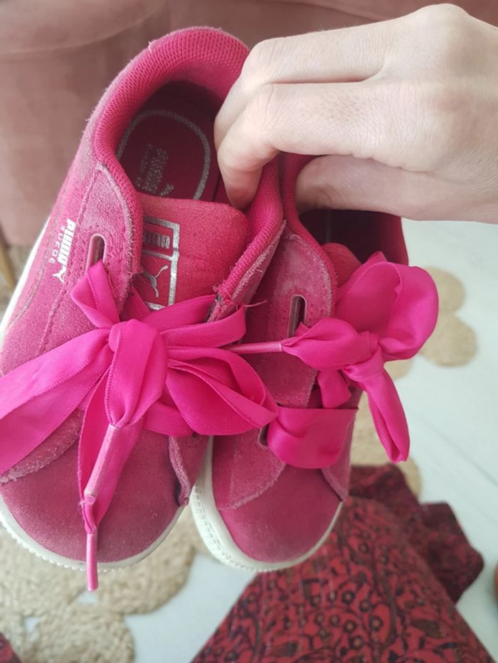 Peu portées. Tissu velours un peu sali, mais normal. Lacets satin. Roses et blanches. Pointure 27. Puma. #chaussurestatiana #27 #baskets #puma #satin #velours