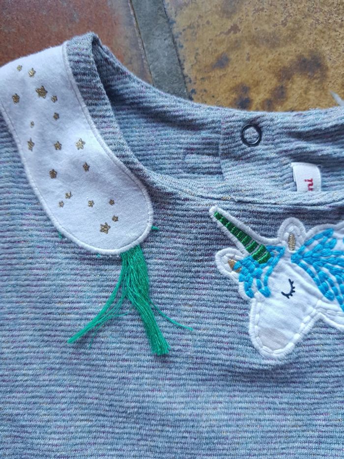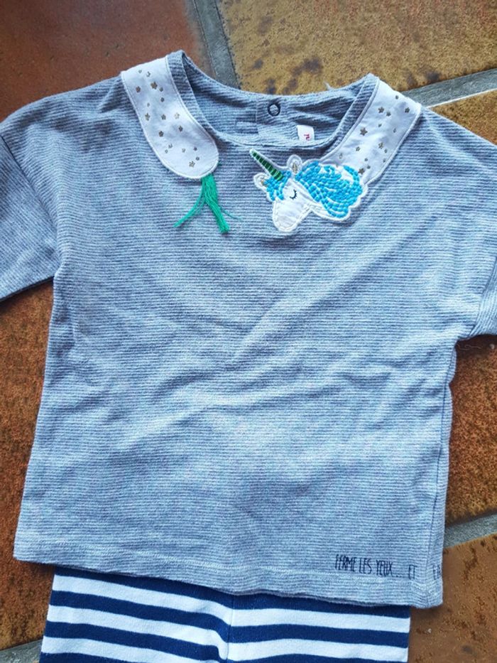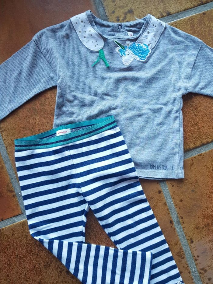 Sublime petit ensemble catimini. Leggings à rayures tout doux (légèrement taché à un genou cf.photo). Haut à paillettes gris et col licorne. Taille 3 ans. Attention le sac n est pas à vendre. #3anstatiana #licorne #catimini #ensemble #misaison #fille #3ans