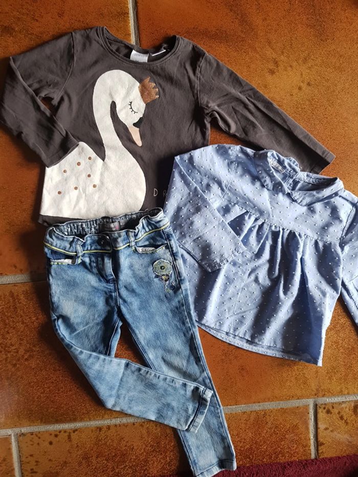 Sublime. Blouse à pois en reliefs lc kids by little cigogne Jean souple orchestra avec broderies Tee shirt Zara motif cygne et dorures. Taille 4ans. #4anstatiana