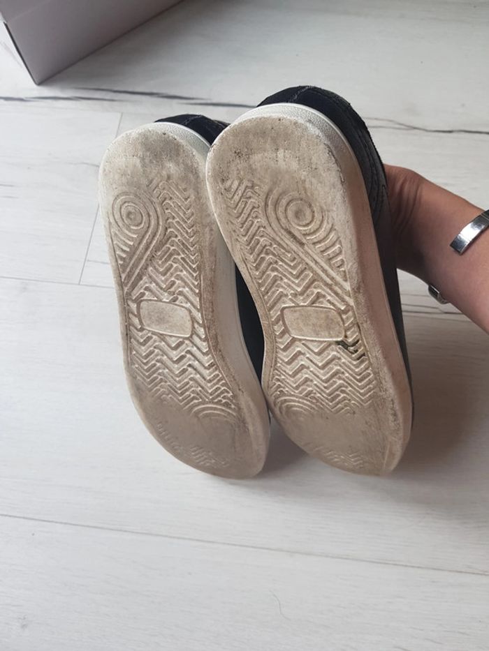 Portées à peine 3 ou 4 fois. Achetées un peu trop justes et mon fils a changé de pointure. Petites rayures à l'arrière (pour chipoter cf.photo) mais sinon très bon état. Modèle Carole ellesse. Achetées 55e. Noires blanches et dore/rouille. Pointure 37 mixtes. #chaussurestristan