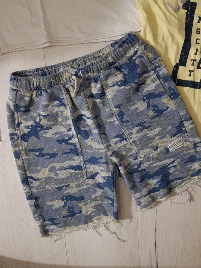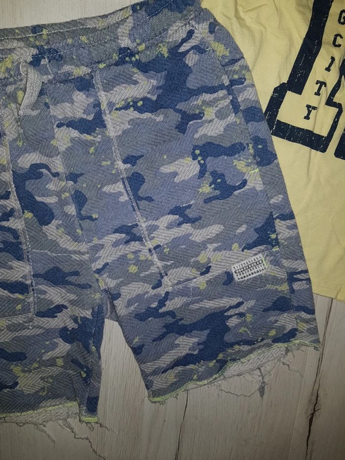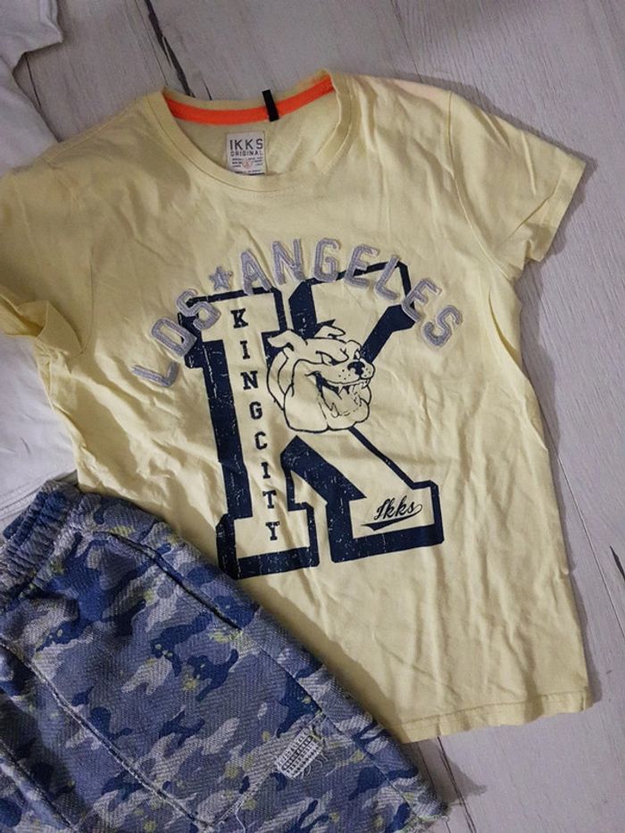 Superbe ensemble 3 pièces dans les tons jaune blanc bleu. Tee shirt jaune ikks Tee shirt blanc bouledogue Zara Bermuda effet camouflage bleu Zara #10anstristan #zara #teeshirts #ete #estival #bermuda #ikks #armee #camouflage