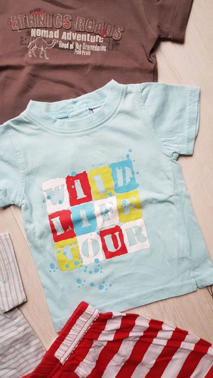 Très bon état. Lot de 3 tee shirts 1 combinaison et 1 short. Très mignon. Marques canari baby petit pirate vertbaudet