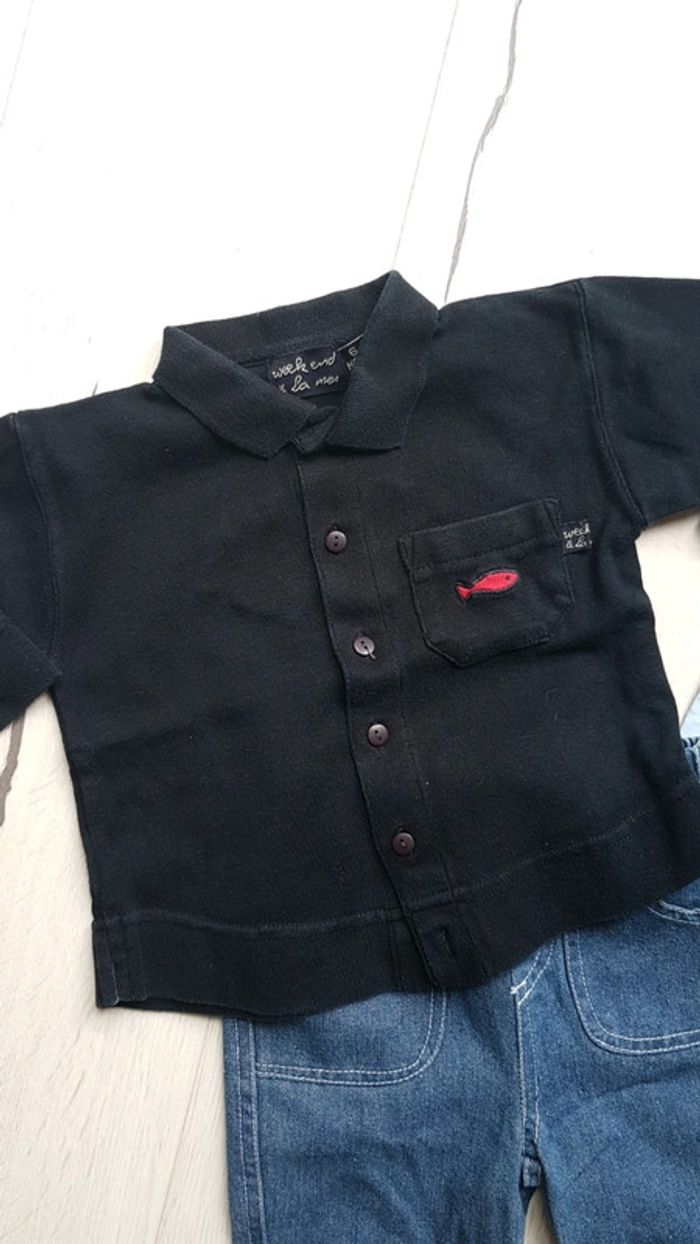 Très bon état. Jean bleu Tee shirt bleu ciel Pull week end à la mer noir et rouge. #6moistristan #pull #weekendalamer #teeshirt #pantalon #6mois