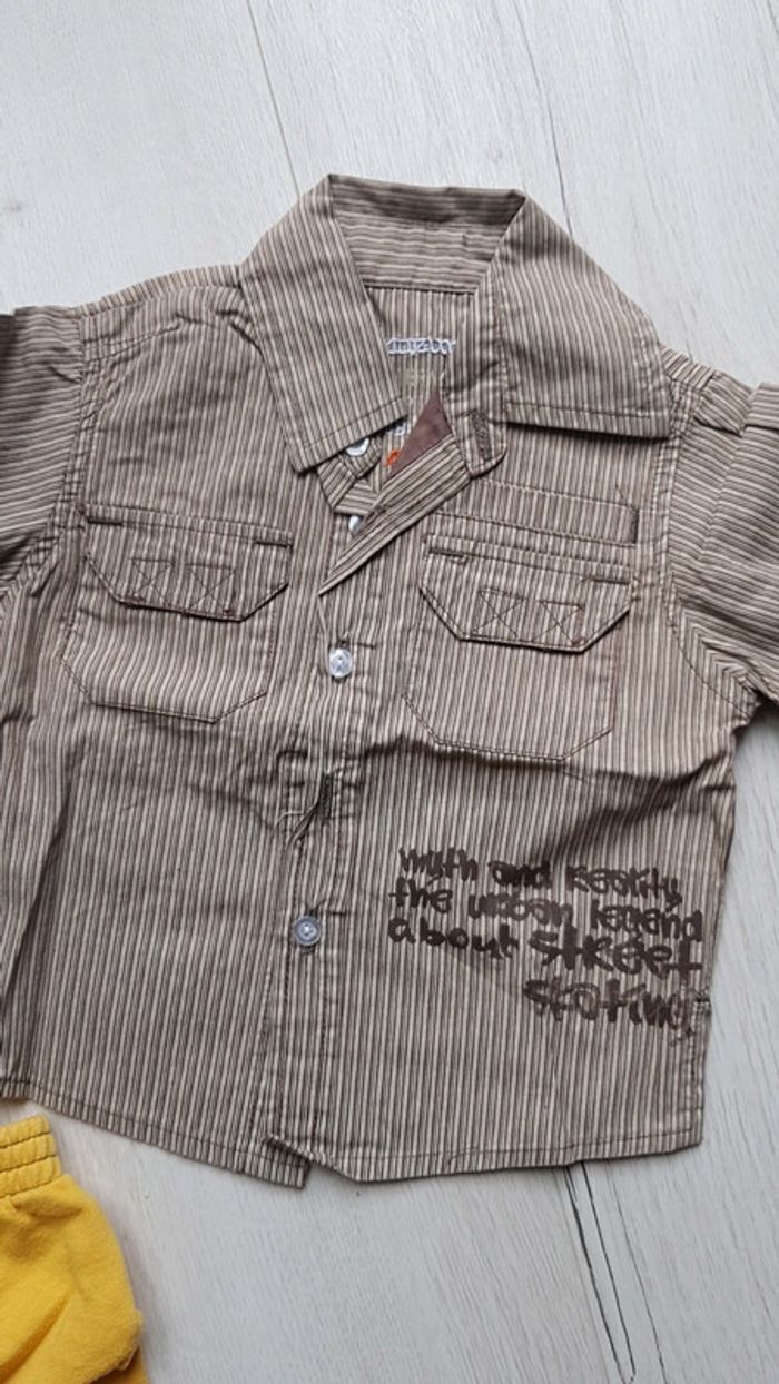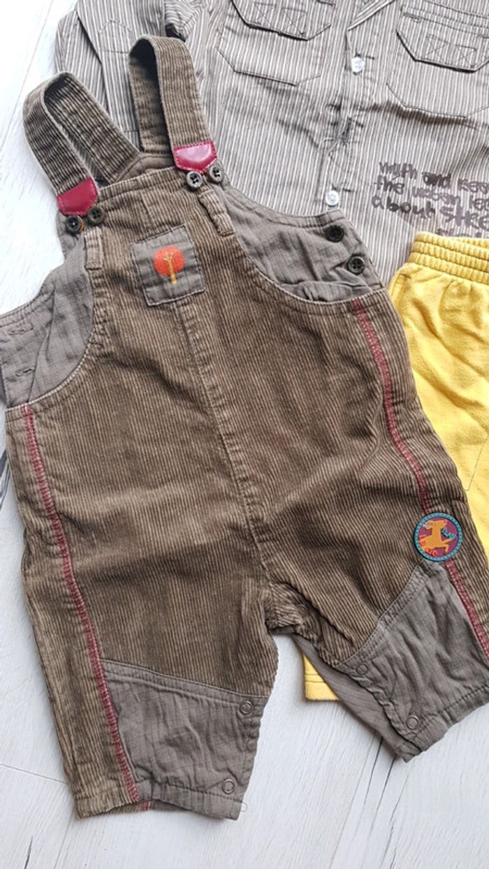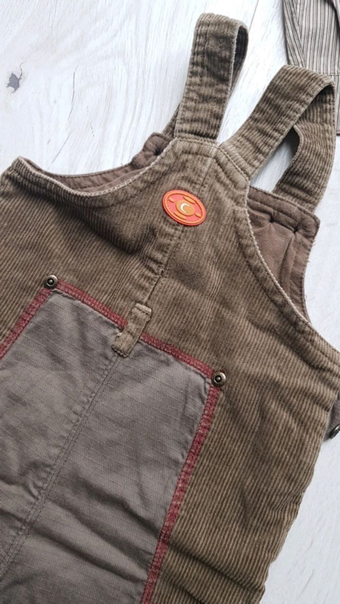 Trop trop mignon. Idéal pour mi saison hiver. Salopette molletonné la compagnie des petits marron. Chemise et pantalon jaune assortis. Marques inconnues. Taille 6mois. #6moistristan #salopette #6mois #chemise