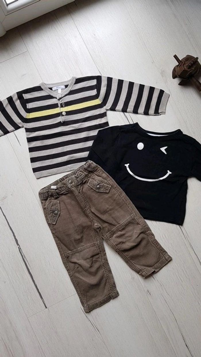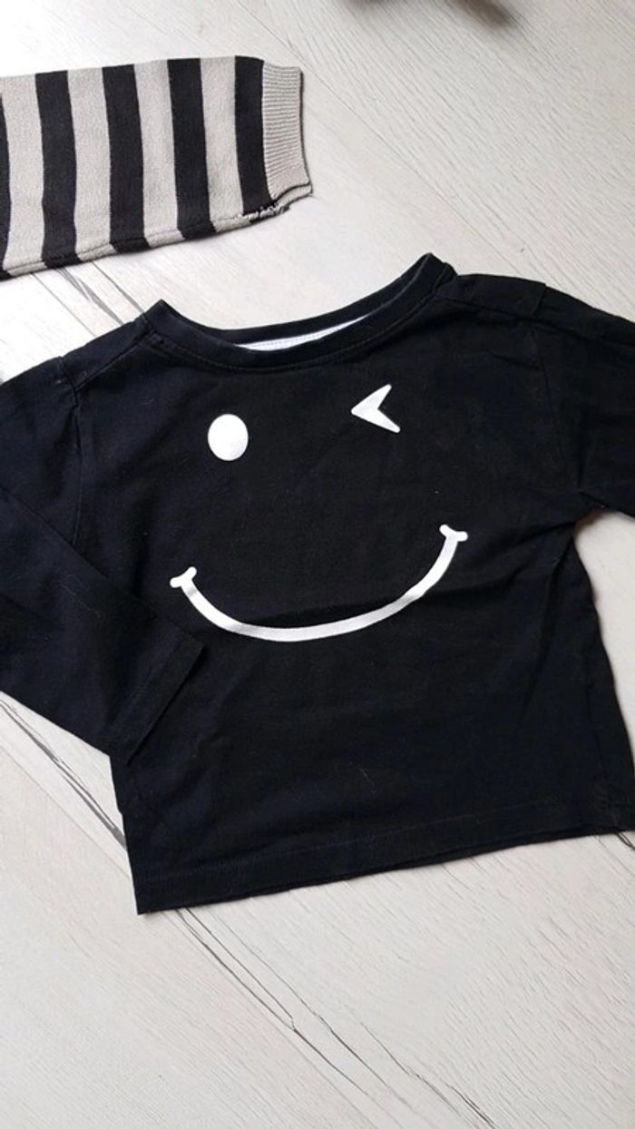 Ensemble 3 pièces 18mois garçon. Pull à rayures Kitchoun Pantalon Obaibi Tee shirt noir smiley Mini Rebel Coloris noir marron beige. #18moistristan #obaibi #ensemble #18mois #kitchoun #smiley