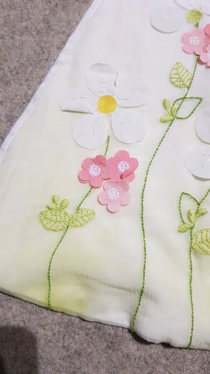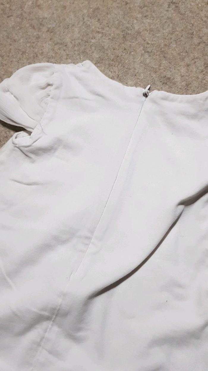 Portee lors d'une cérémonie. A signaler une trace (cf.photo, partira sûrement au lavage). Trop mignonne. Fleurs en relief. Froufrous au niveau des épaules. Mayoral 9mois. #9moistatiana #mayoral #ceremonie #ete #estival #dore #9mois