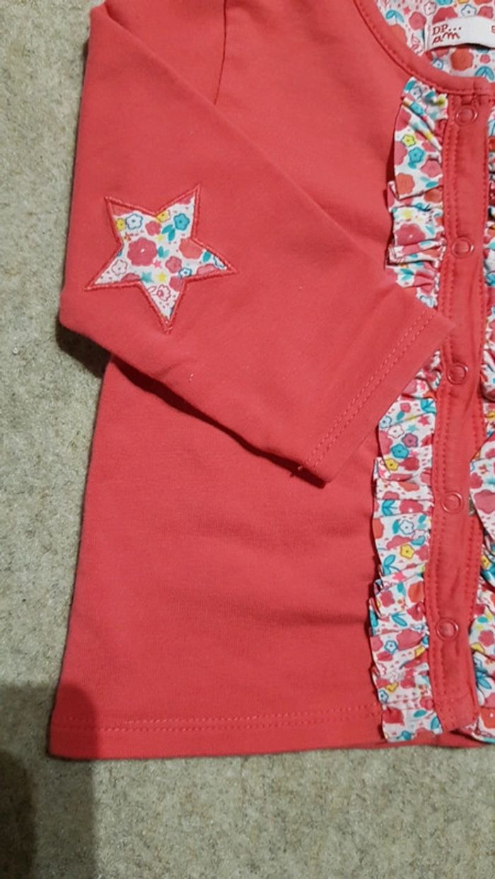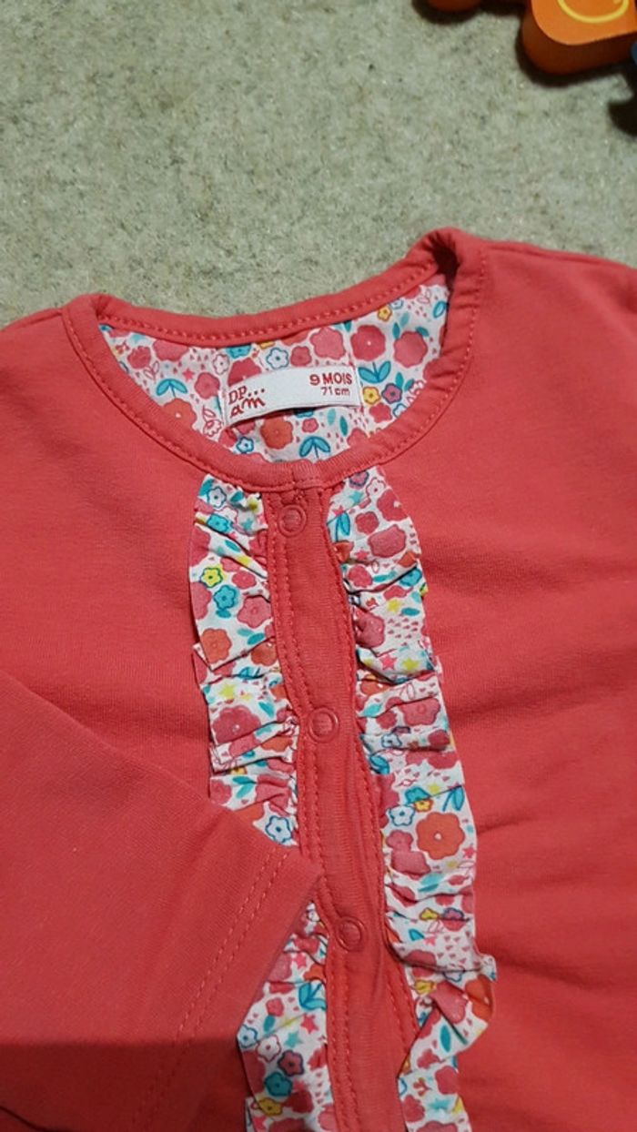 Neuf malheureusement jamais porté. Trop mignon. Coloris rose corail à fleurs et froufrous. Du pareil au même 9mois. #9moistatiana #gilet #dpam #dupareilaumeme #fille #Ensemble #9mois #neuf