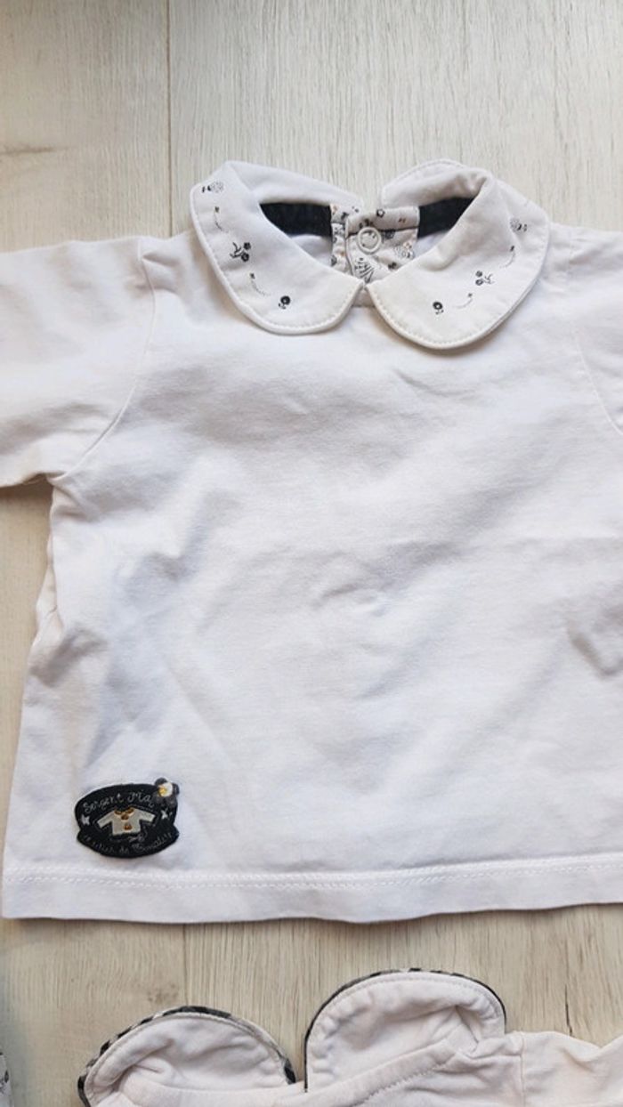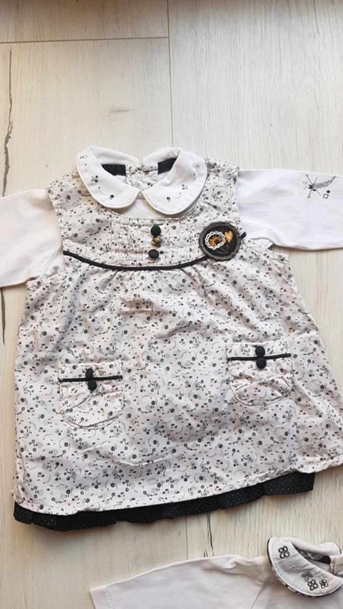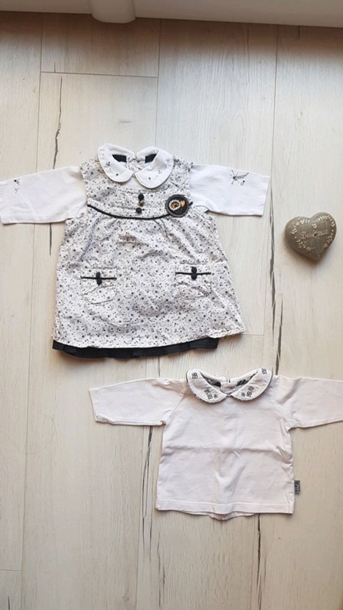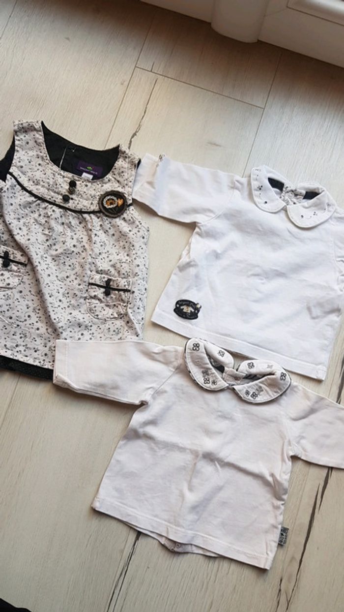 Très bon état à peine porté. Sergent major motifs assortis. Robe et 2 tee shirts manches longues à motifs brodés et boutons à l'arrière pour enfilage facile. Coloris noir et blanc. #1moistatiana #Ensemble #1mois #robe #teeshirts #fille #sergentmajor #sm