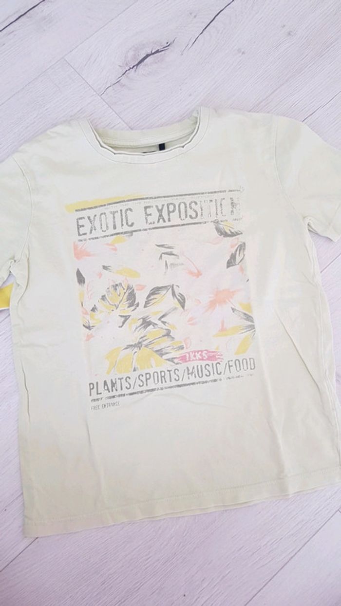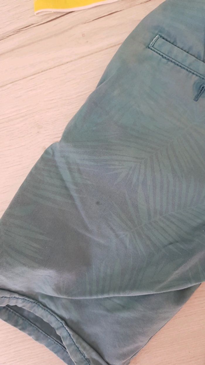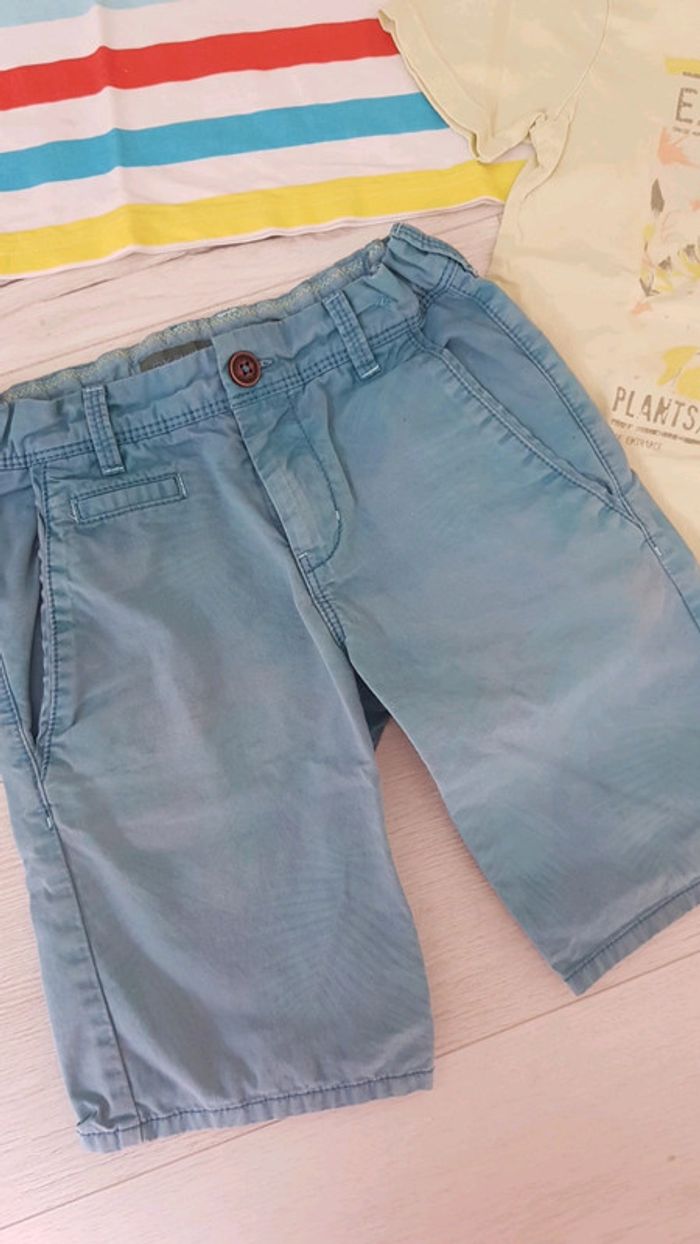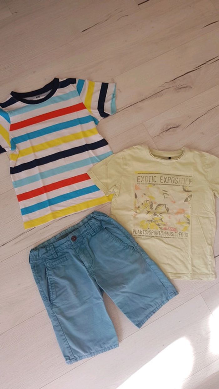 Très bon état. Tee shirt jaune pâle ikks. Tee shirt à rayures h&m. Bermuda bleu à motifs de palmiers okaidi (mini tâche cf.photo que j essayerai de faire partir au lavage). #6anstristan #hm #fleurs #ete #estival #bermuda #okaidi #ikks #chino #garçon #teeshirts