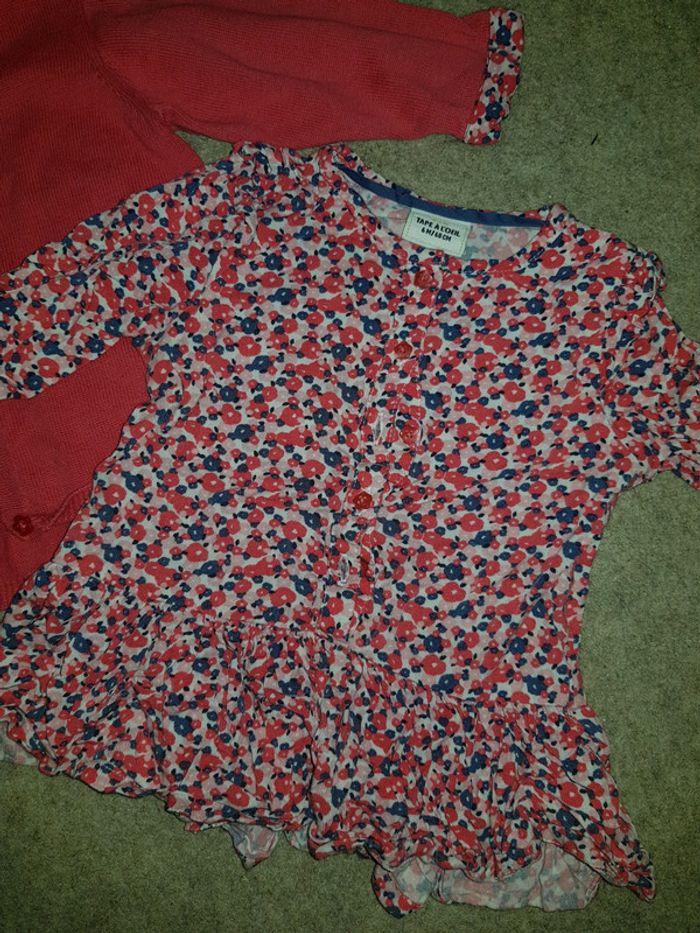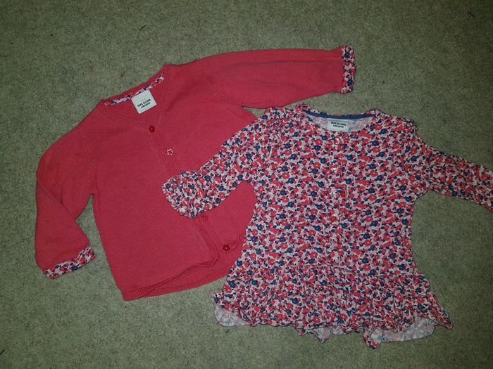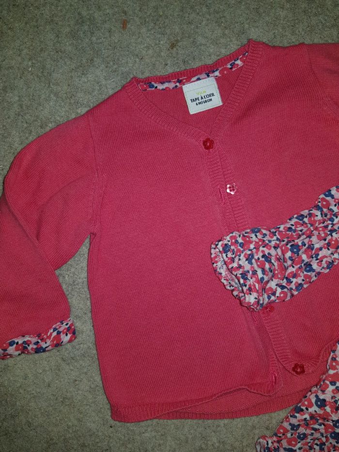 Très bon état. Superbe ensemble très girly... Gilet et blouse assortis tape à l'oeil rose fushia et fleurs marines. #6moistatiana