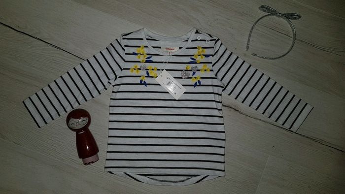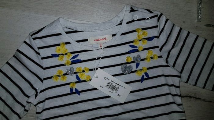 Neuf étiqueté. Marque catimini. Motifs fleurs mimosa. Paillettes sur le tissu, très joli 😍. Ma fille n'a pas eu le temps de le porter. Style mariniere. #2anstatiana #catimini #neuf #teeshirts #tresbonetat #vintedstyle #vintedaddict #vinted