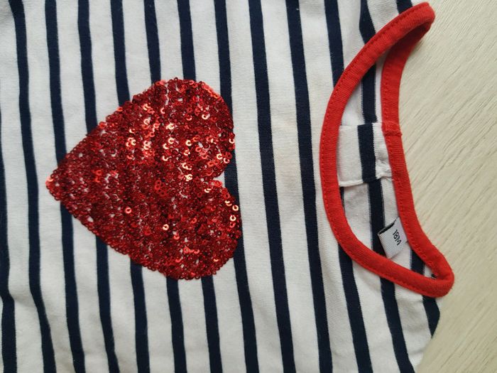 Très bon état. Rayures bleu et blanc avec coeur en paillettes rouges. Trop cute... #18moistatiana #robe #mariniere #fille #vinted #tresbonetat #vintedstyle #vintedaddict #vinted