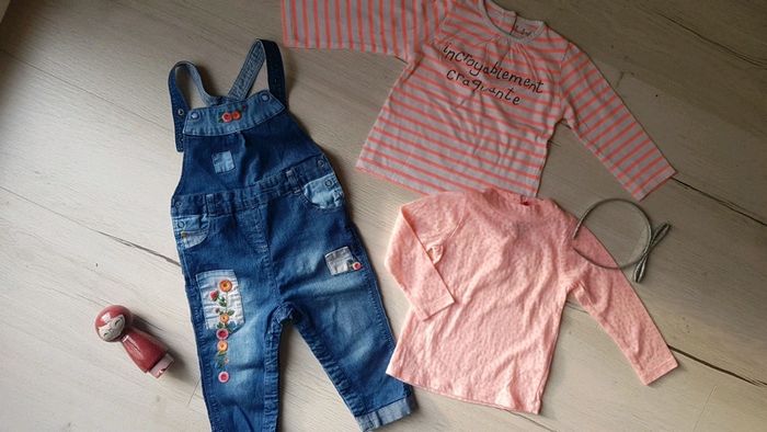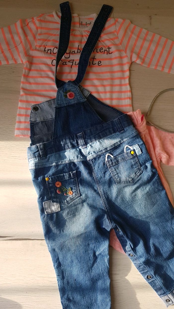 Excellent état. Jolie salopette avec pressions et divers motifs floraux recto verso de chez orchestra. Auxquel s'ajoute 2 hauts dans les mêmes coloris. Pour petite fille fashion. Coloris bleu jean et orange corail flashy. #18moistatiana #salopette #jean #teeshirts #orchestrafille #lahalle #orchestraaddict #orchestra18moisbebefille