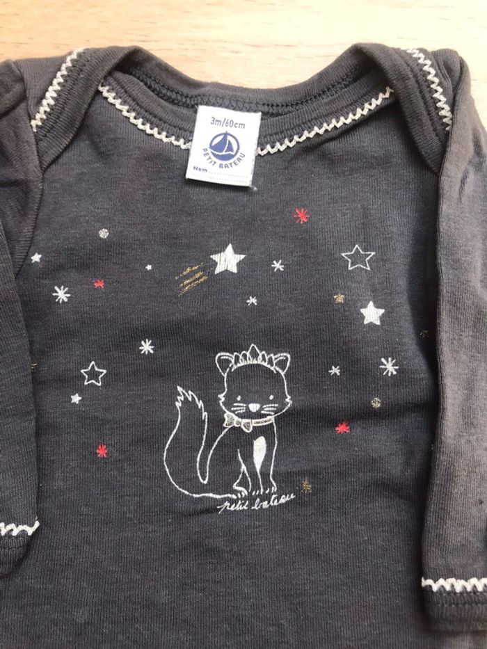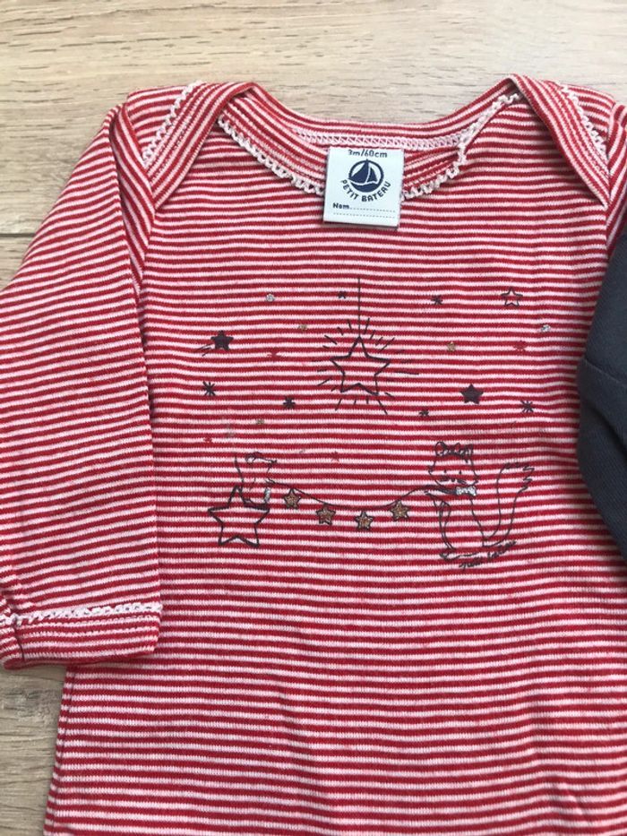 Lot de 2 bodies 3m petit bateau manches longues un rayé blanc et rouge et l’autre anthracite motifs chats #cinineaw_fille3m
