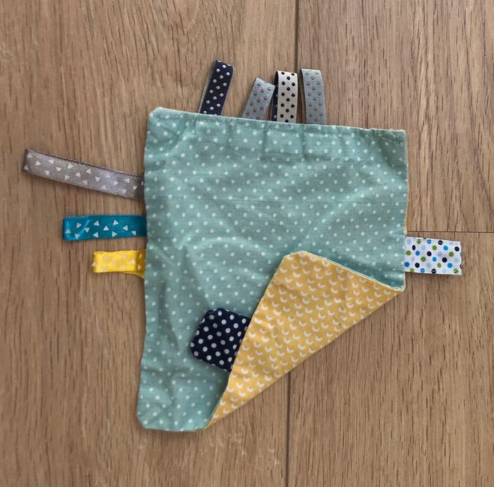doudou plat handmade avec plein d’étiquettes comme aiment tant les bébés 😍 un côté turquoise et un côté jaune #cinineaw_jeuxjouets #cinineaw_puericulture