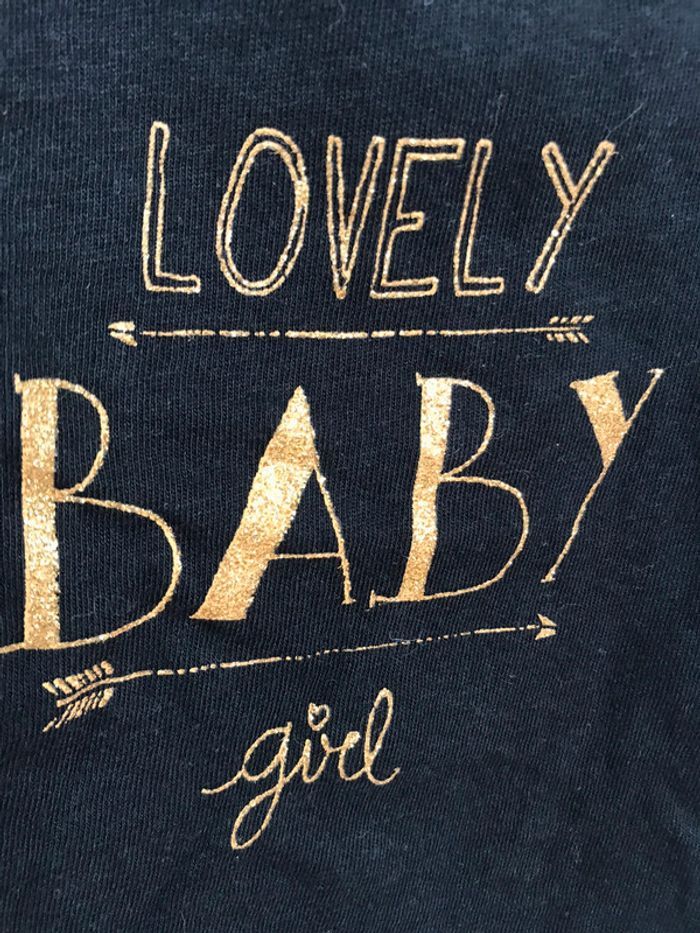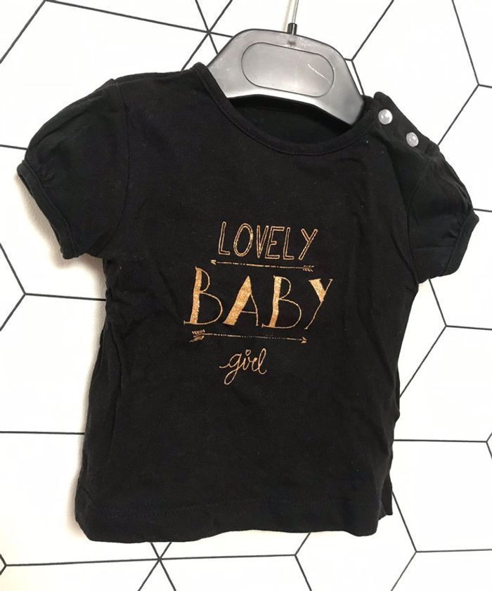 lot de 2 tee shirts manches courtes 1 mois Kiabi un noir avec écritures dorées un blanc marinière à rayures rouges avec noeud en tulle