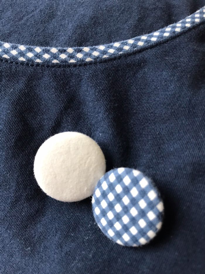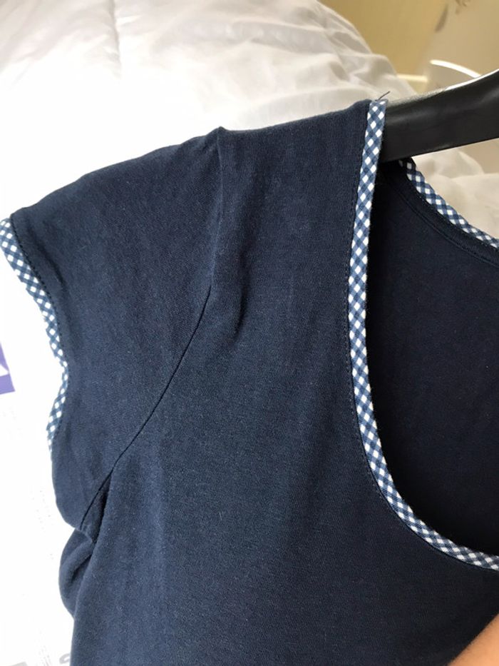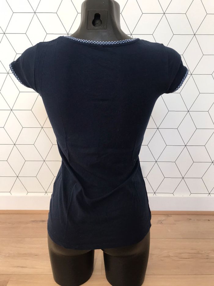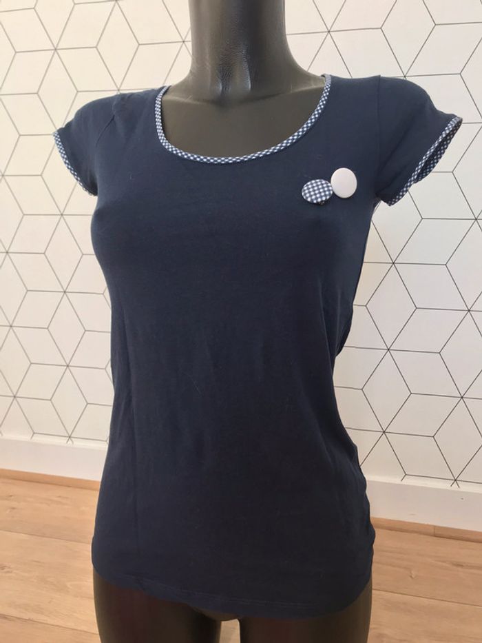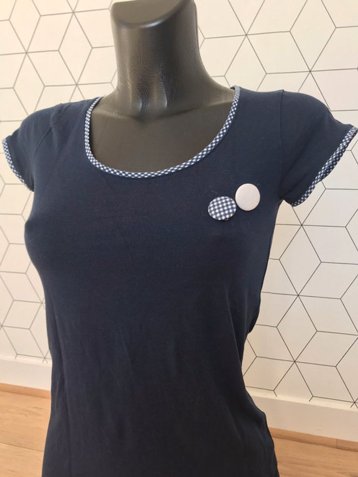tee shirt bleu marine badges amovibles col liseré quadrillé bleu et blanc idem aux manches #cinineaw_femme38