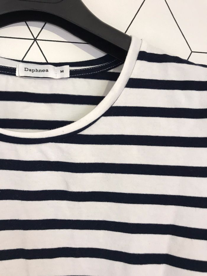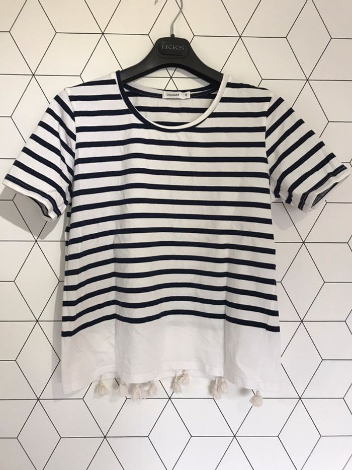 haut marinière a rayures blanches et bleu marine pompons dans le bas #cinineaw_femme38