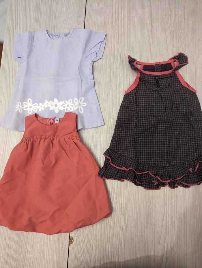Descriptif à bien lire 😊 Vend lot de vêtements d'été en très très bon état tout marque confondu. Ne pas oublier que ça reste du seconde main donc possibilité de trouver un petit fil qui dépasse ou même une légère tâche cachée que je n'aurai pas vue. (Mais normalement tout est ok) Ce lot est taille 3 mois contien: - 6 bodies - 1 ensemble t-shirt et leggins - 2 ensemble avec culotte - 6 combinaison - 7 robes - 1 chemisier Prix non négociable.