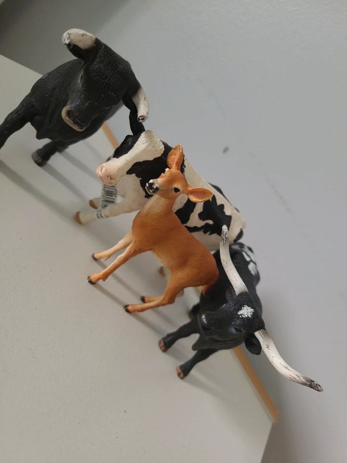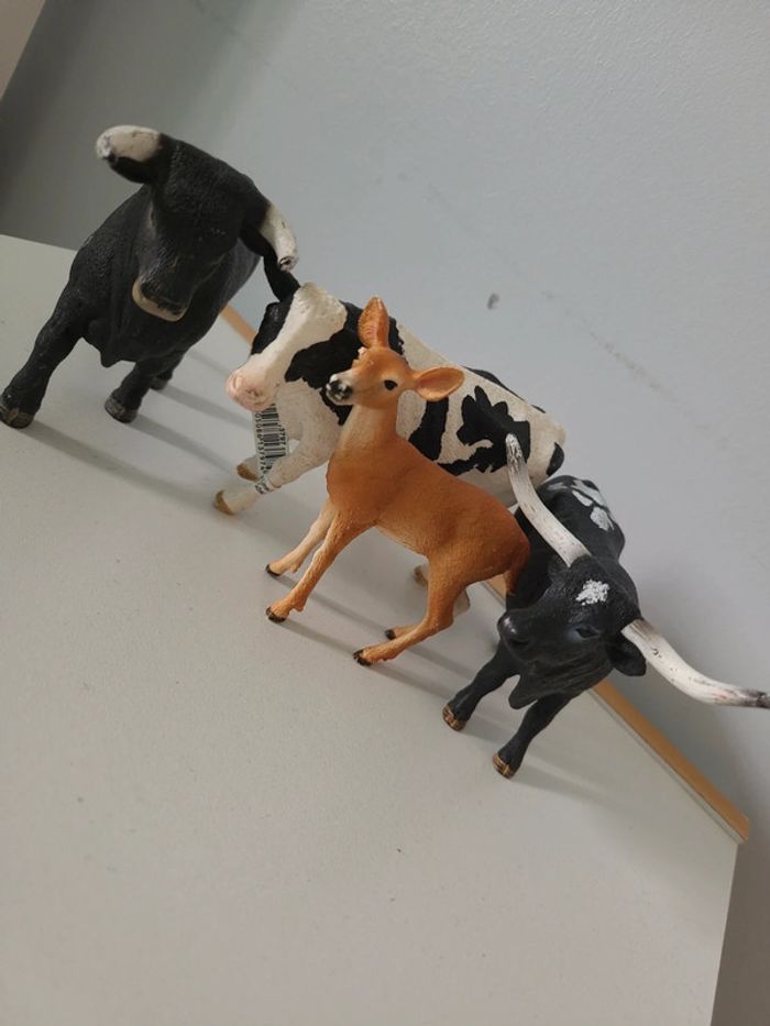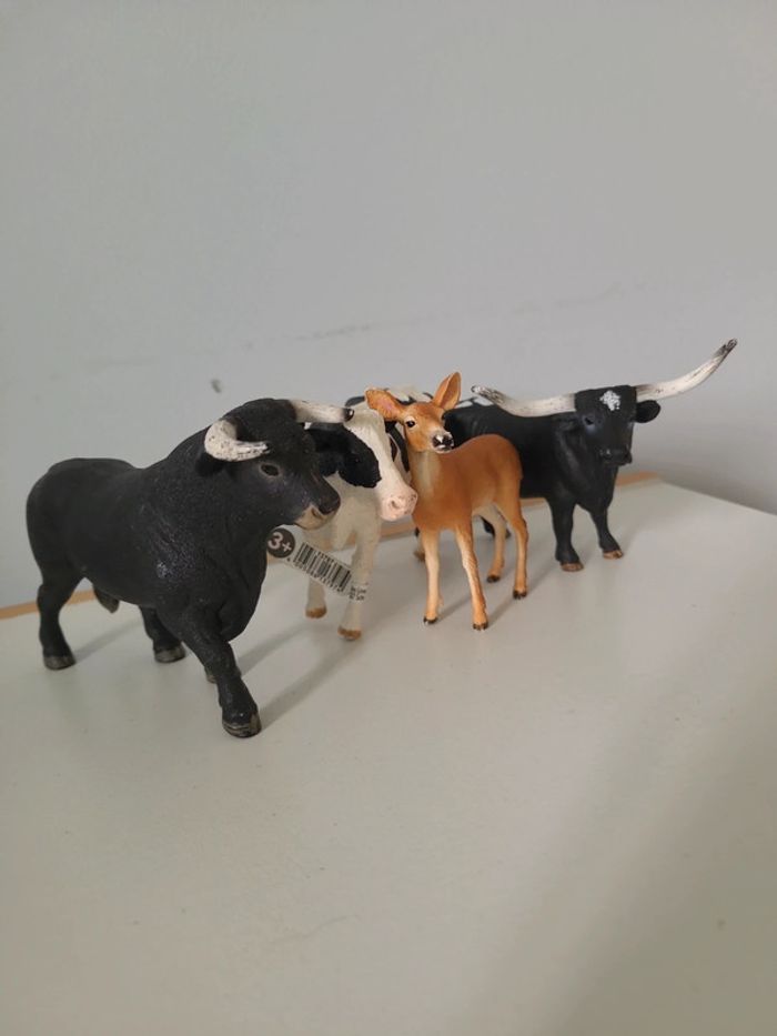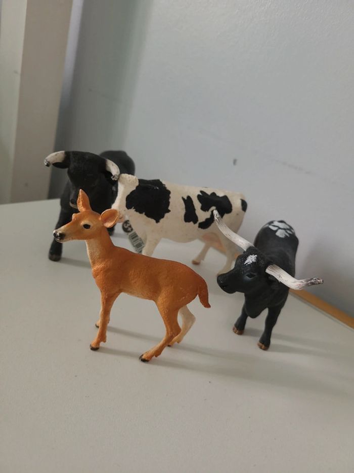 2 taureaux 1 vache et une biche Bon état général Ca reste des jouets qui ont servi à jouer...