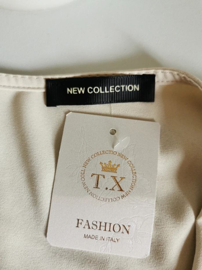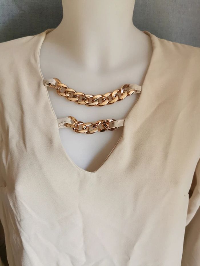 Neuf, avec étiquette, jamais porté Chemisier beige avec chaînes décoratives Manches longues bouffantes Made in Italy Taille 40-42 Remise en main propre possible sur montargis #Lauradamienfemme40 #Lauradamienfemme42