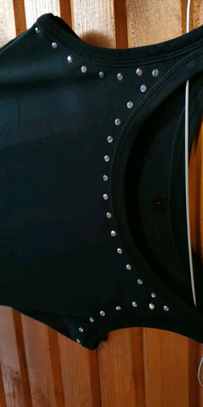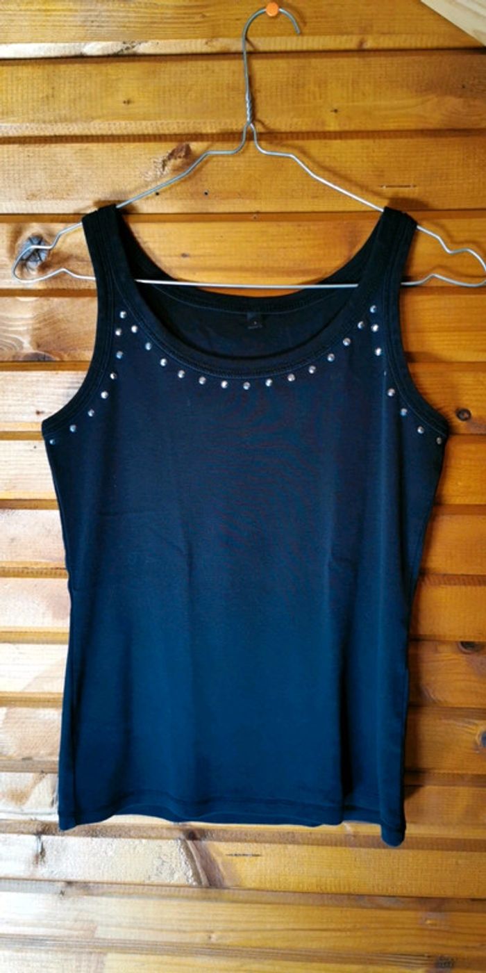 Très bon état Débardeur noir avec strass Taille 1 100% coton, matière agréable et élastique Remise en main propre possible sur montargis et sens #Lauradamienfemme36