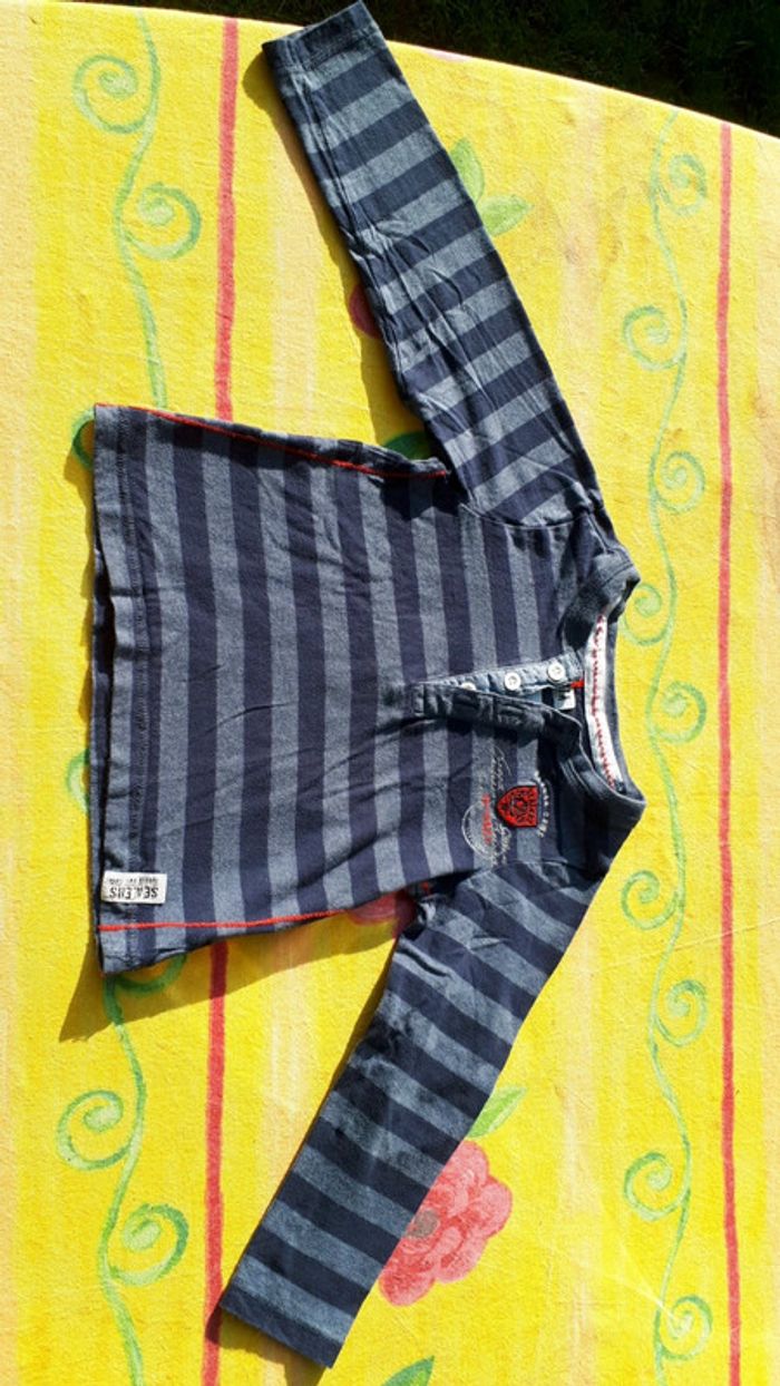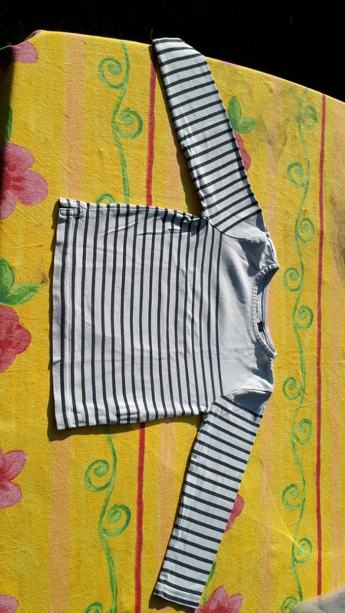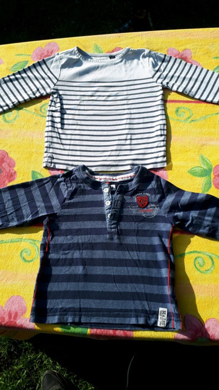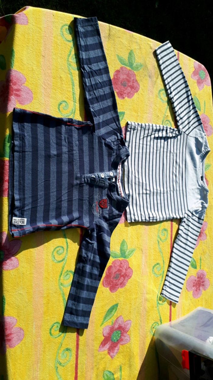 Très bon état Lot de 2 t-shirts manches longues Le rayé marine est en parfait état Le rayé blanc a une micro tâche (voir photo) Taille 5 ans Marque Okaidi et Tissaia Remise en main propre possible sur montargis et sens #Lauradamiengarcon5ans