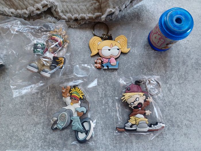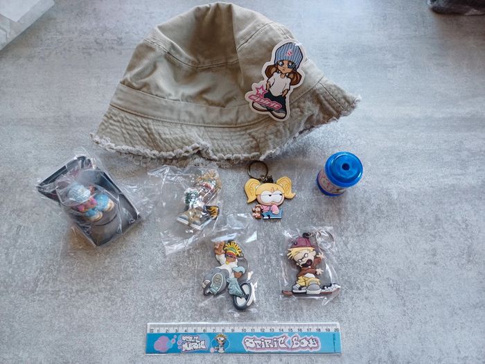 Il y a 1 bob/chapeau 1 taille crayon 1 règle 20 centimètres 5 porte-clé 1 petite figurine Tout est neuf