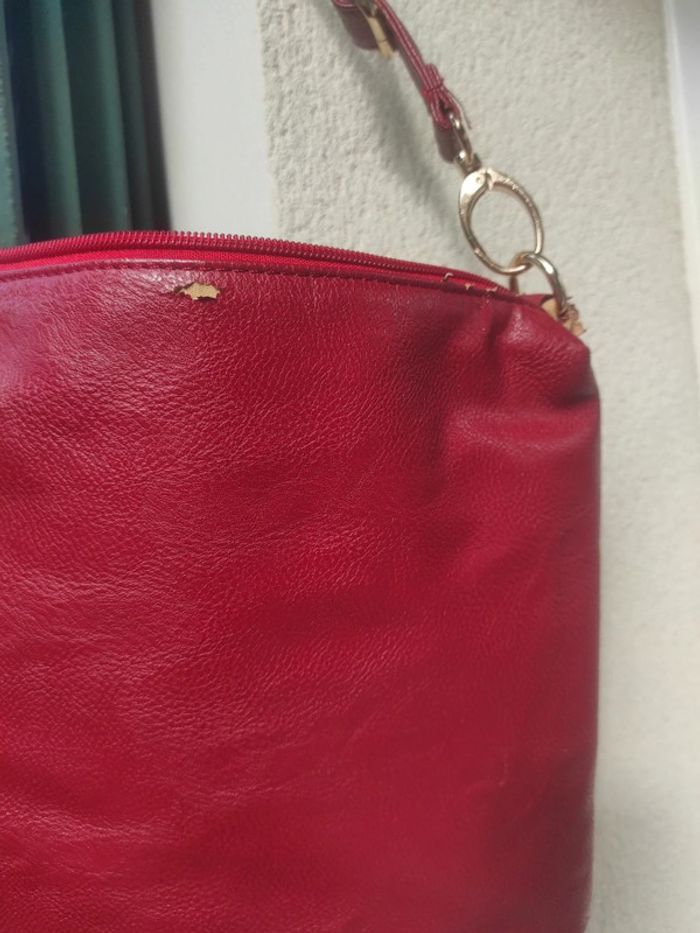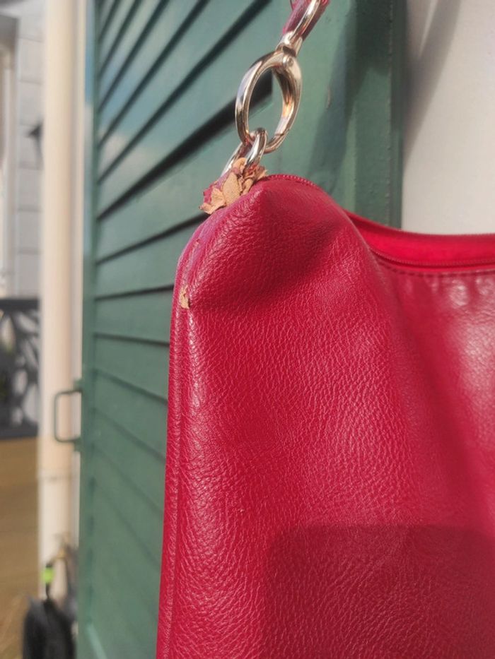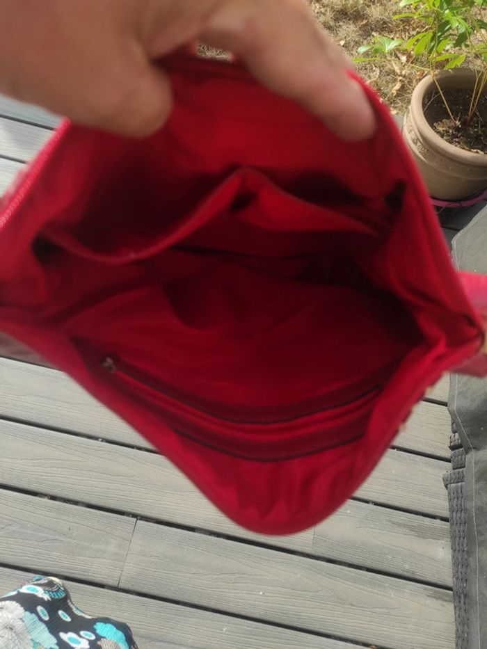 En simili cuir rouge avec des défauts, voir photos L'intérieur est nickel Plusieurs poches intérieures Fermé par fermeture éclair Couleur rouge foncé Dimensions : 31 cm x 26 cm