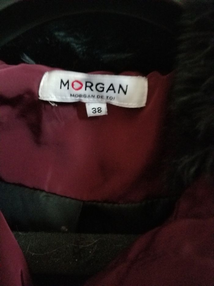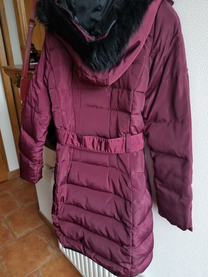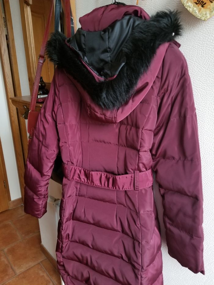 Parka avec capuche et ceinture en polyester. Rembourrage plumes et duvet de canard